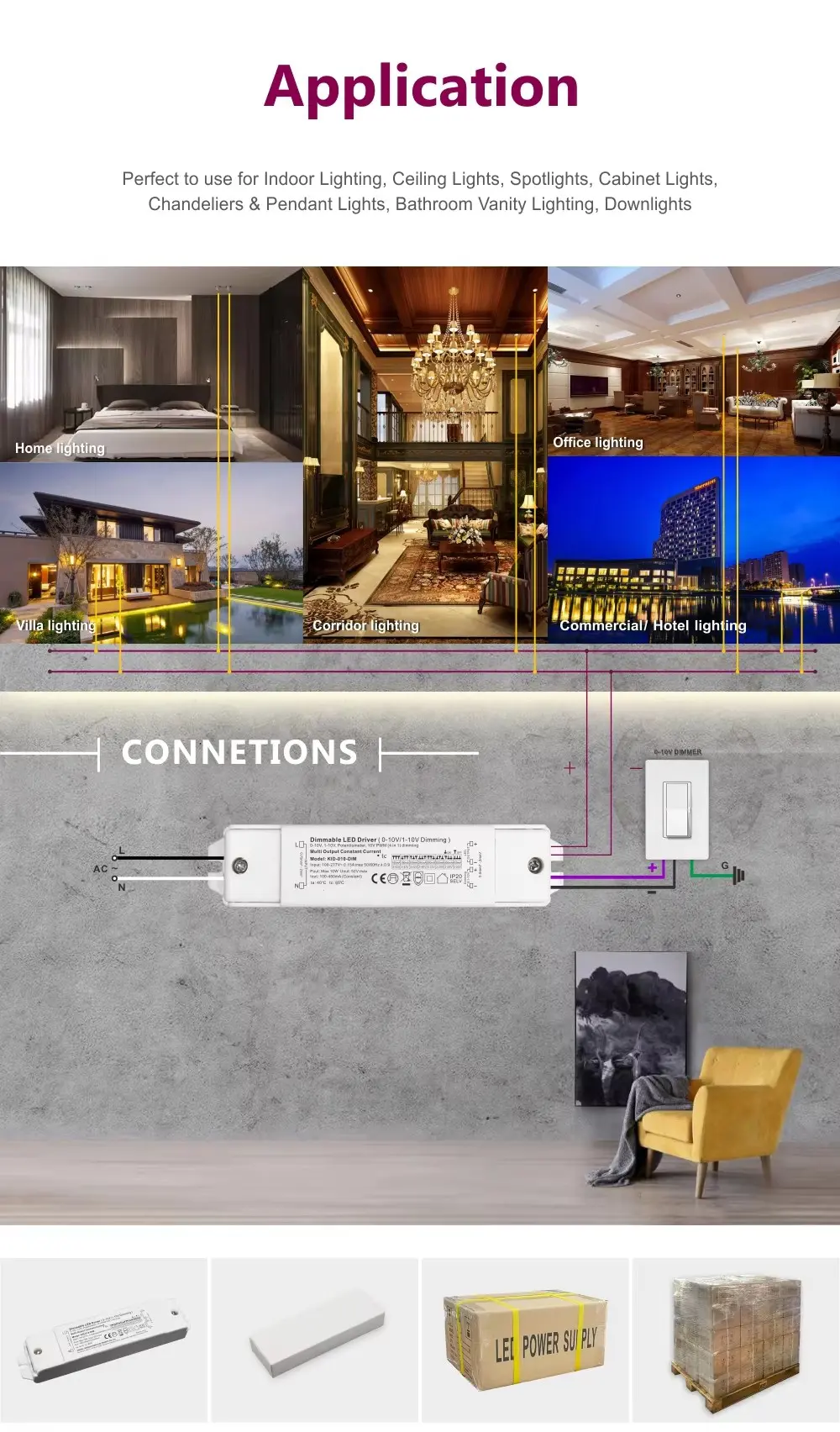 일관된 성능을 제공하도록 제작된 이 조광기는 넓은 3~42V DC 출력을 지원하므로 광범위한 일반 저전압 LED 모듈 및 스트립과 호환됩니다. 광범위한 입력 전압 수용으로 다양한 전기 환경에서 안정적인 작동을 보장합니다. 10W에서 60W까지 부하를 구동할 수 있는 이 제품은 가정의 악센트 조명, 후미 및 캐비닛 아래 작업 조명부터 호텔, 레스토랑, 사무실의 보다 까다로운 주변 조명에 이르기까지 다양한 실내 응용 분야에 완벽하게 적합합니다.
