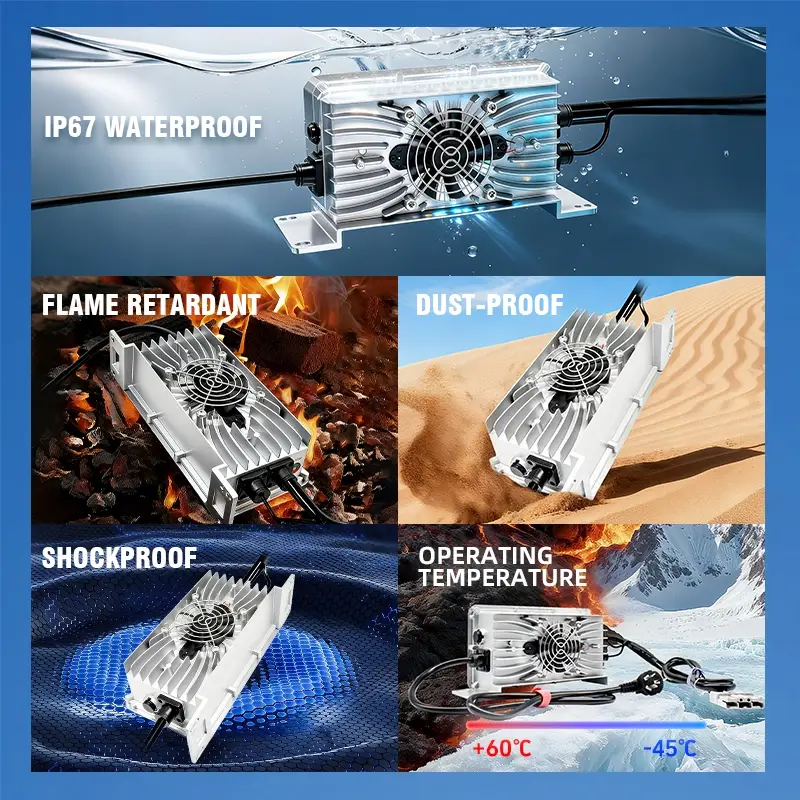 전체 알루미늄 합금 쉘은 플라스틱 쉘에 비해 방열 효율을 35% 향상시켜 1.2kW 연속 작동 중에 충전기의 작동 온도를 60℃ 미만으로 유지하여 내부 구성 요소를 보호하고 서비스 수명을 연장합니다. 또한 과전압 보호(최대 55V), 과전류 보호(최대 28A), 단락 보호, 과열 보호 등 다층 안전 보호 메커니즘을 갖추고 있어 충전기와 배터리의 손상을 효과적으로 방지하고 모든 온보드 환경에서 안전한 작동을 보장합니다.