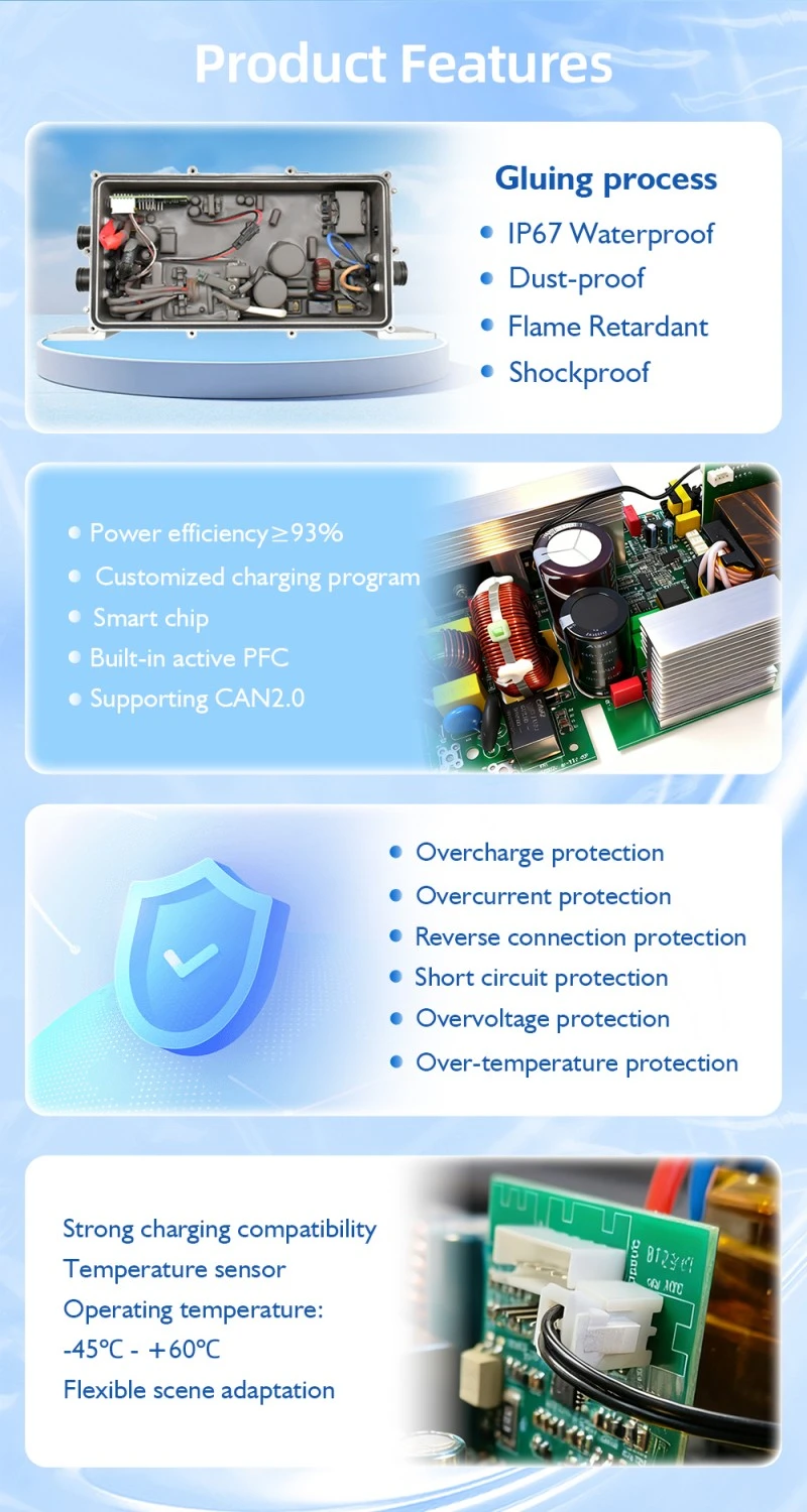 1.2kW 정격 전력과 25A 출력 전류를 자랑하는 이 1.2kW 온보드 배터리 충전기는 48V 100Ah 배터리를 단 4시간 만에 완전히 충전할 수 있으며 이는 일반 1000W 충전기보다 20% 빠릅니다. 고효율 회로 설계는 에너지 손실을 10% 미만으로 줄여 에너지를 절약하는 동시에 급속 충전을 보장하므로 빠른 배터리 보충이 필요한 시나리오에 이상적입니다.