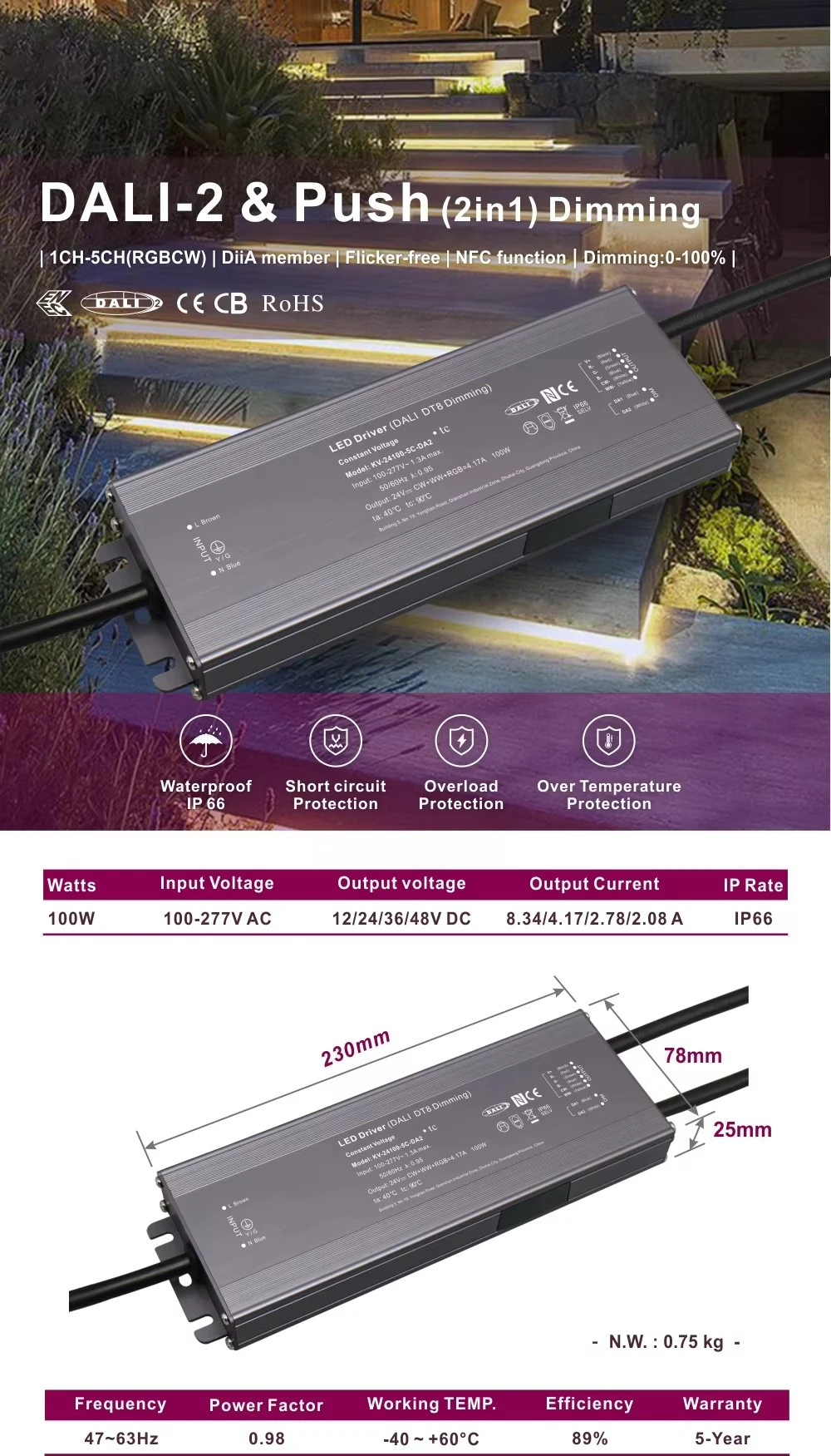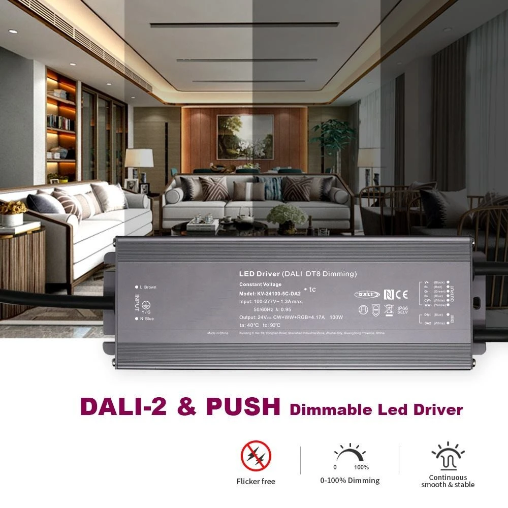 중국의 전문 LED 드라이버 제조업체인 Starwell의 이 100W DALI 정전압 CCT 디밍 LED 드라이버는 DALI-2 인증을 받았으며 원활한 조명 제어를 위해 0.1%에서 100%까지 정밀한 디지털 디밍을 제공합니다. 여기에는 자유 공기 대류를 통한 수동 냉각을 통해 단락, 과부하 및 과열에 대한 필수 보호 기능이 포함되어 있습니다.