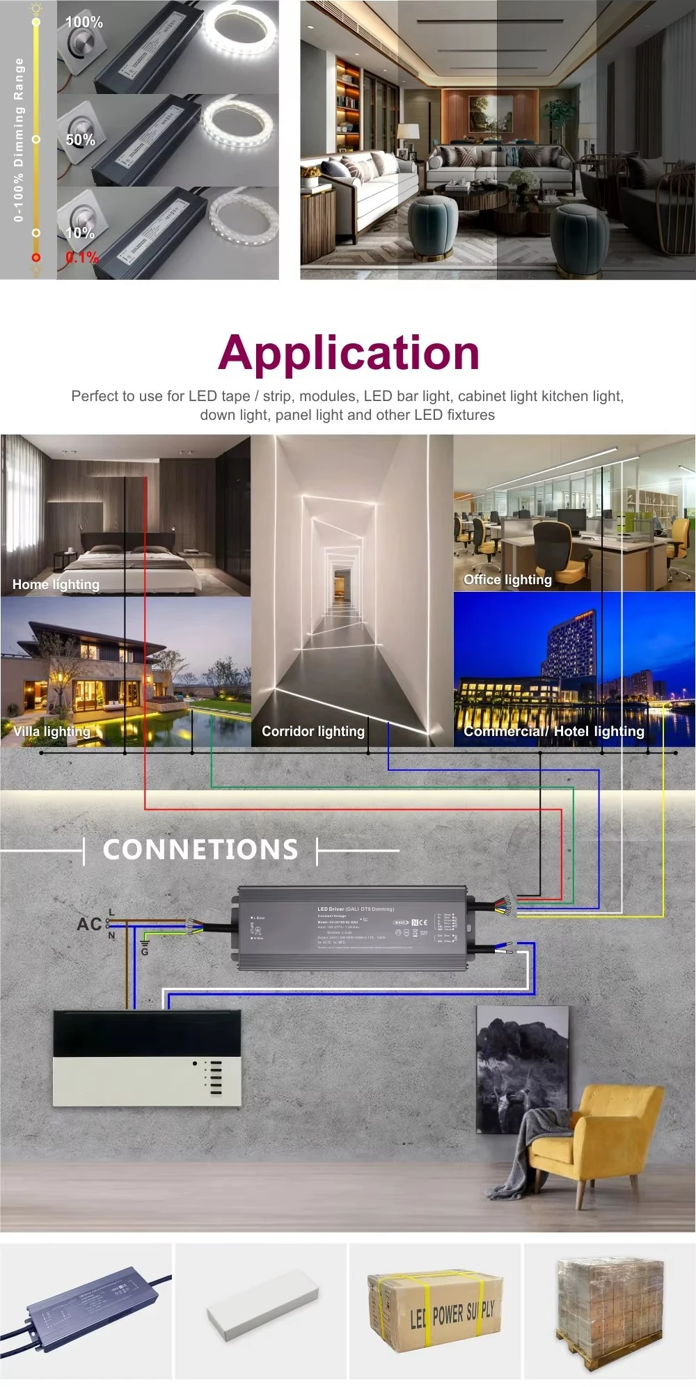 건조하고 습하고 습한 장소에 적합한 전체 알루미늄 보호 하우징.(미국) 디자인 특징: 선형 디자인, 완벽한 프로필 및 안전 규정도 준수합니다. 디밍 기능: DALI-2 디밍
