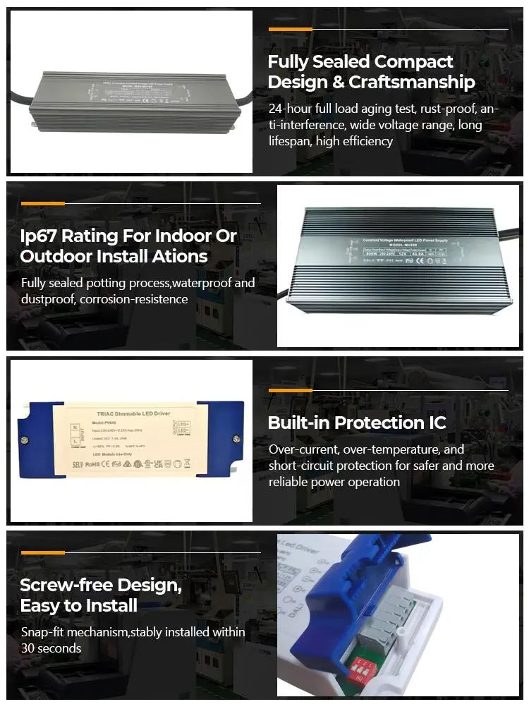 STARWELL 고품질 1200mA 정전류 방수 LED 드라이버는 실외/습한 환경의 LED 조명 기구용으로 특별히 설계되었으며 10-40W 가로등, 정원 조명, 수중 조명, 광고 라이트 박스 및 기타 여러 시나리오와 호환됩니다. 고정밀 정전류 칩을 채택하여 출력 전류 오류는 ±3% 이하이며 1200mA에서 정확하고 안정적으로 유지되어 깜박임(깜박임 깊이 <5%) 및 빛 감쇠 문제를 근본적으로 제거하여 LED 조명기구의 서비스 수명을 30% 이상 연장할 수 있습니다. IP67 방수 밀봉 기술 + 방수 포팅 기술을 탑재하여 방수 수준은 수심 1m에서 30분 동안 누출이 없으며 비, 물 튀김, 먼지 등 혹독한 환경에 대처할 수 있으며 실외 연속 작업 수명은 50,000시간 이상이므로 장기간 사용 시 더욱 안정적입니다.