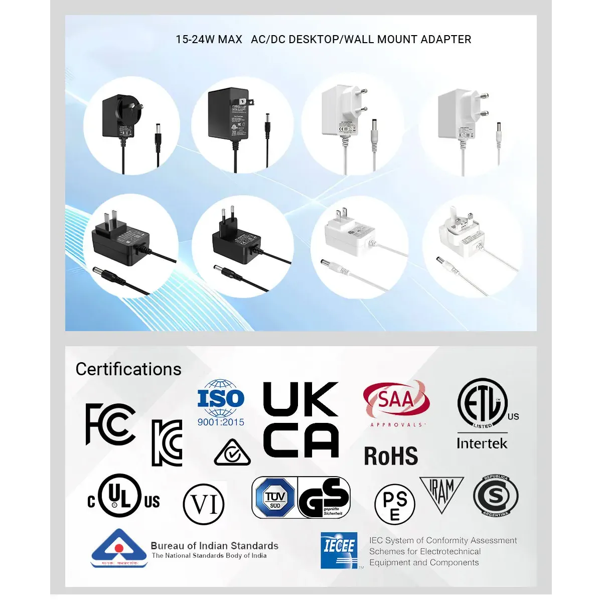 24W 전원 어댑터 시리즈는 엄격한 국제 표준을 충족하고 CE/FCC/UL/RCM/SAA/UKCE/KC/BIS/PSE 인증서를 포함한 글로벌 인증을 자랑하여 안전 및 환경 규정 준수를 보장합니다. 유럽형 플러그 디자인으로 안전한 연결이 가능하므로 다양한 환경에서 쉽게 사용할 수 있습니다.