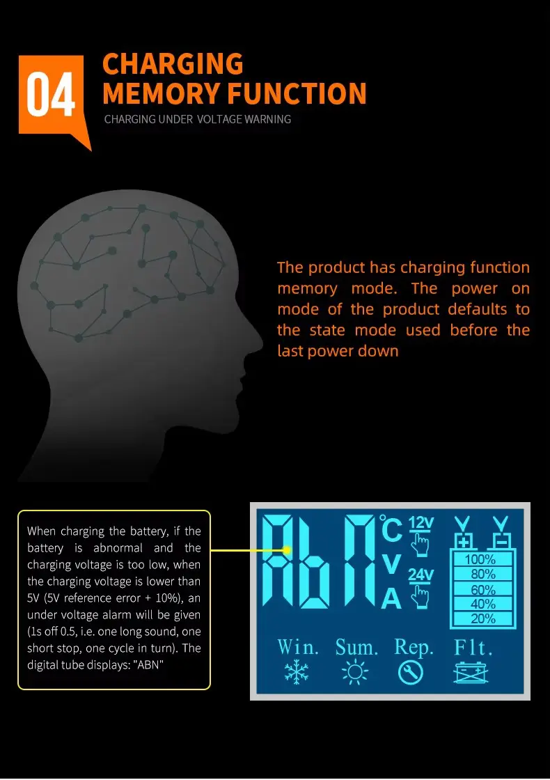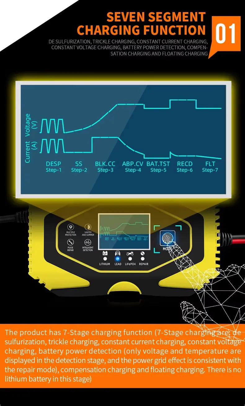 7단계 충전기는 칼슘, 젤 AGM, 습식, 리튬을 포함한 대부분의 배터리 유형에 적합합니다. 납산. LifePo4 배터리. 또한 방전된 배터리와 황산염 배터리를 복원하는 데 도움이 될 수도 있습니다.