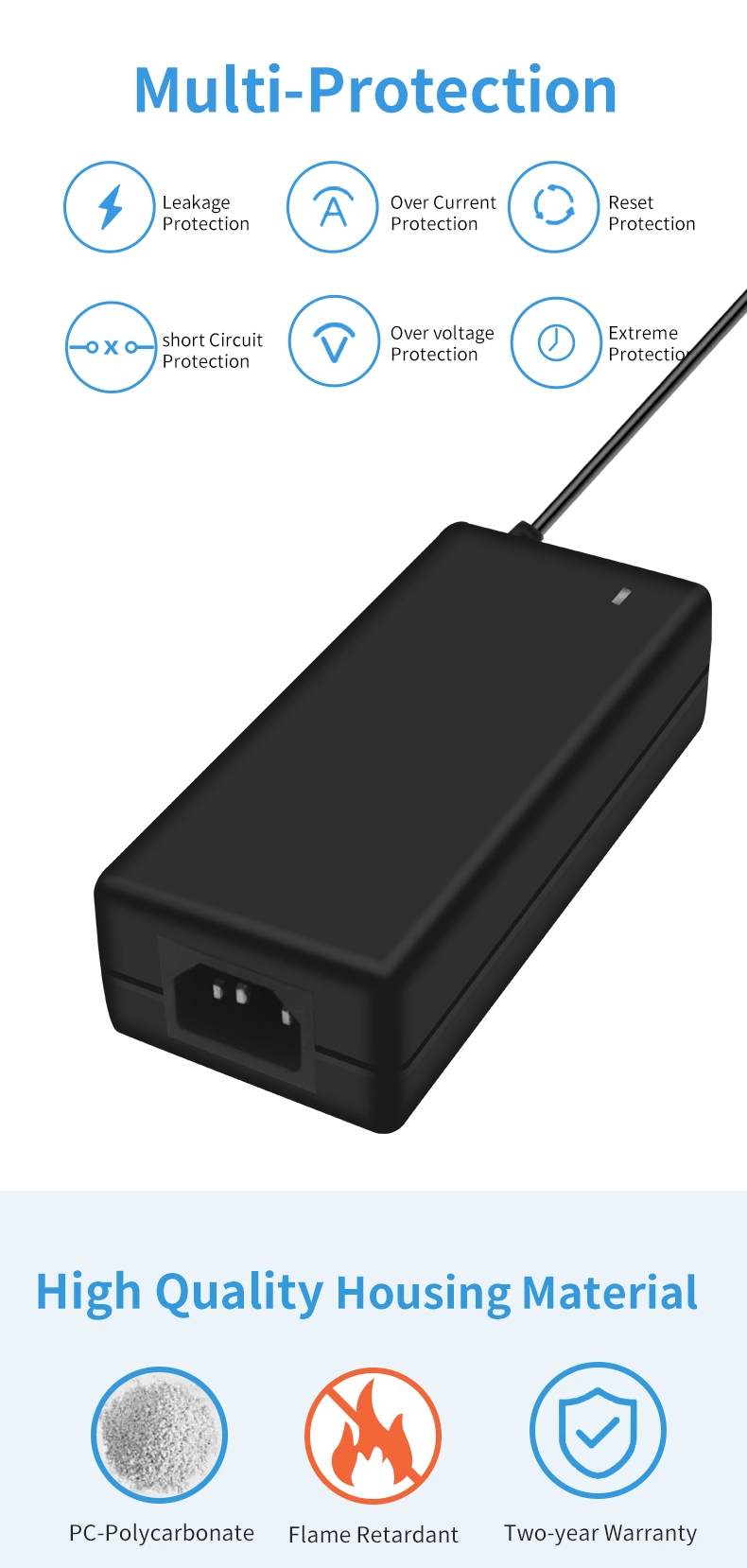STARWELL 전원 어댑터는 UL/CE/FCC/CCC와 같은 국제 표준에 의해 인증되었으며 6계층 보호 기능(15V에서 트리거되는 OVP, 8.5A에서 OCP, 85℃에서 OTP, 단락, 서지 및 ESD 보호)을 통합합니다. PC+ABS 난연성 케이스는 V0 가연성 등급에 도달하여 750℃에서 연소 시 30초 동안 연소에 저항하여 잠재적인 안전 위험을 제거합니다.