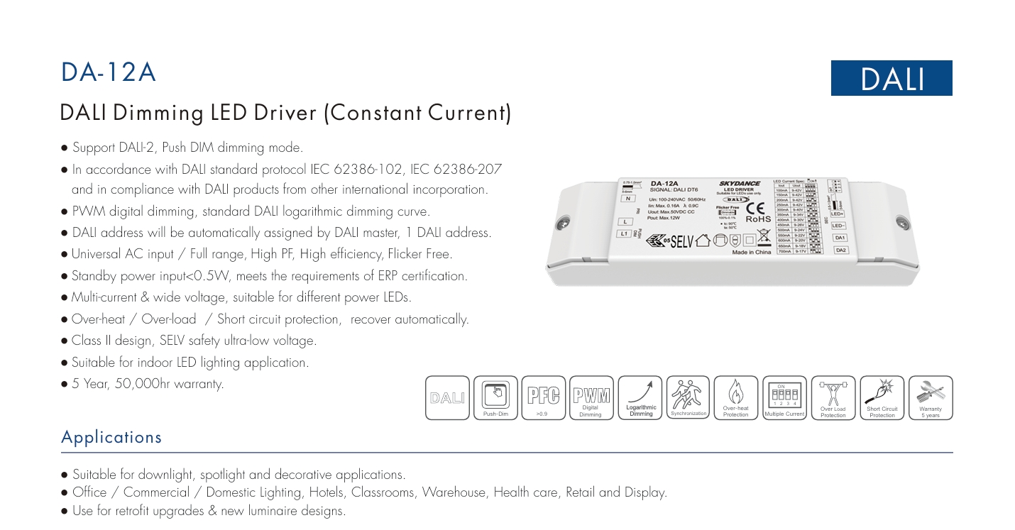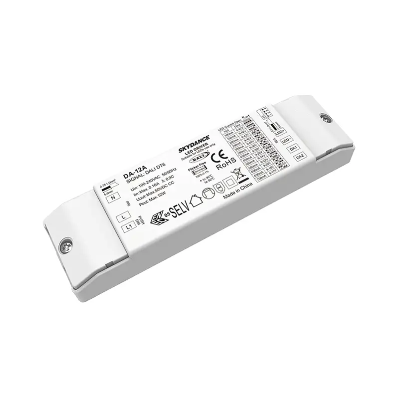 STARWELL 공장의 고품질 12W 정전류 DALI 디밍 가능 LED 드라이버는 지능형 조명 시스템을 위한 고성능 코어이며 글로벌 DALI 프로토콜 및 100-240V AC 넓은 입력과 호환됩니다. DALI 디밍 가능 LED 드라이버는 ±5% 정확도로 안정적인 정전류 출력(조정 가능 100-900mA)을 제공하여 조명기 전반에 걸쳐 일관된 밝기를 보장합니다. T-PWM 디밍 기술을 특징으로 하는 이 제품은 깜박임 없이 0.0001%-100%의 매우 깊은 디밍을 달성하고 눈이 편안한 IEEE 1789 표준을 충족합니다. PF>0.95 및 최대 87% 효율로 에너지 낭비를 줄이는 동시에 IP20 보호 및 -20~50℃ 작동 온도 범위는 주거용, 상업용 및 산업 시나리오에 적합합니다.