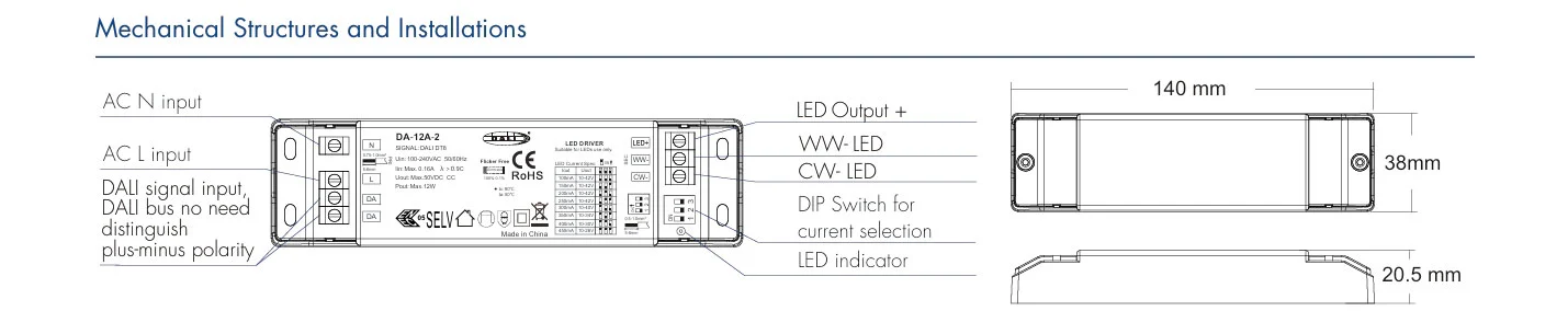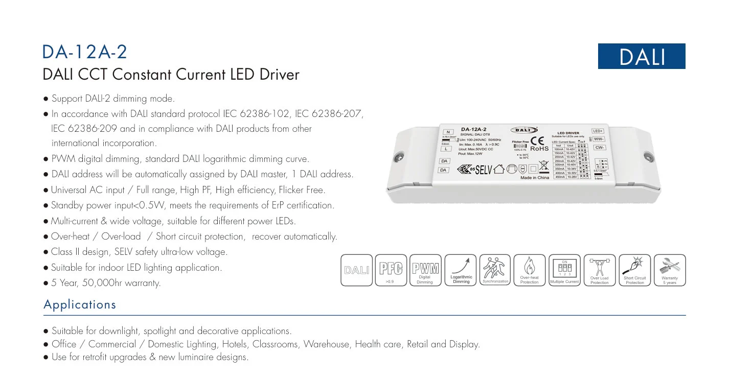 소형 IP20 케이스에 들어 있는 이 조광 가능 LED 드라이버는 LED 프로파일이나 고정 장치 하우징과 같은 제한된 공간에서도 설치를 단순화합니다. 정전류 출력, 광범위한 CCT 튜닝 및 업계 표준 DALI-2 호환성을 결합하여 조정 가능한 백색 다운라이트, 선형 고정 장치 및 건축 조명을 위한 이상적이고 미래 지향적인 드라이버 역할을 하며 다용도 정전류 DALI CCT 디밍 가능 LED 드라이버로서 현대 스마트 조명 생태계에 원활하게 통합됩니다.