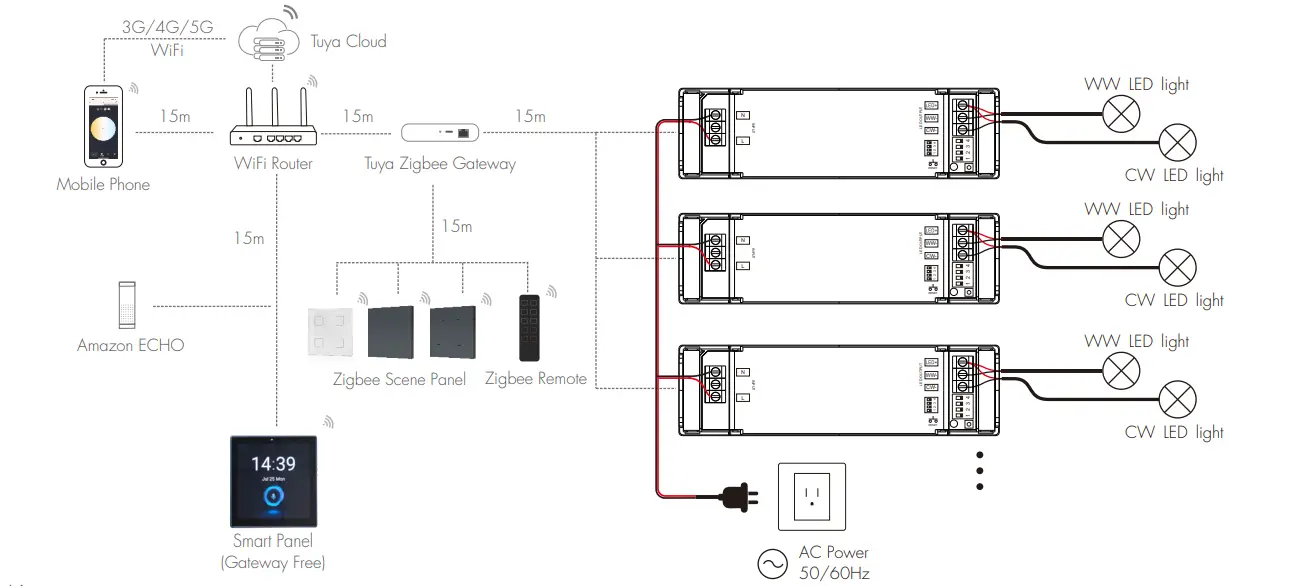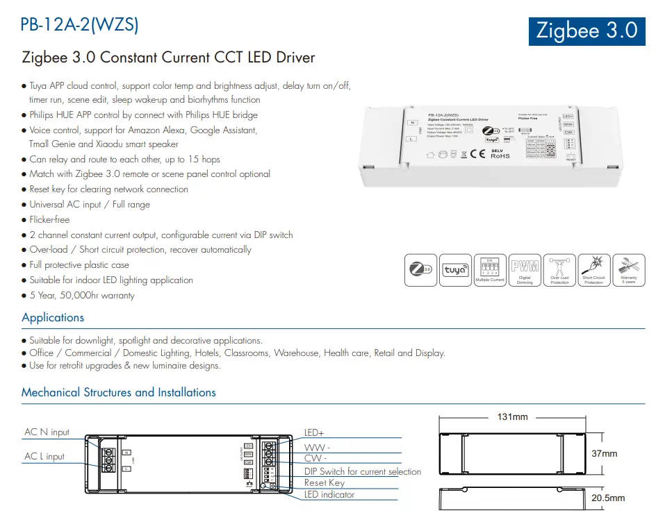 TUYA Zigbee LED 드라이버는 안정적인 무선 연결을 위해 TUYA Zigbee 프로토콜을 완벽하게 지원하여 깜박임 없는 부드러운 CCT 및 밝기 조광을 달성합니다. 앱 제어, 음성 제어, 그룹 제어 및 장면 모드를 지원하여 스마트 조명 시스템에 큰 편의성을 제공합니다.