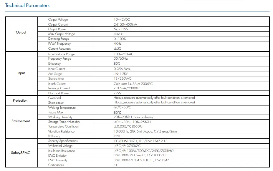 100~240VAC의 범용 입력을 갖춘 CCT 디밍 가능 LED 드라이버는 글로벌 전력망에 적응합니다. 최대 85%의 고효율 및 역률 ≥0.90으로 에너지 소비와 발열을 줄여 드라이버와 LED 수명을 모두 연장합니다.
