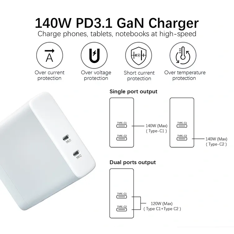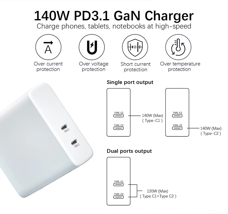 140W 듀얼 USB C 포트 PD 충전기 US 플러그 접이식: 단일 포트는 최대 140W 전력을 제공할 수 있습니다. 듀얼 포트 출력 전력은 지능적으로 동시에 할당됩니다. 노트북과 휴대폰을 동시에 충전해도 효율성은 변함이 없습니다.
