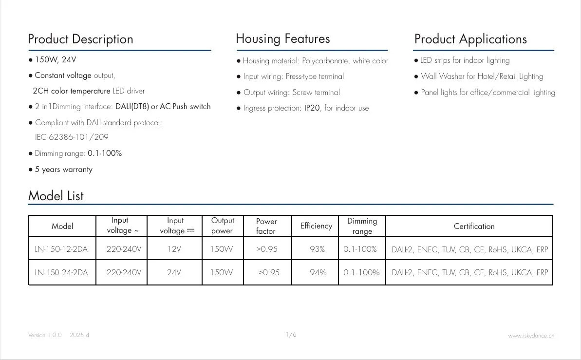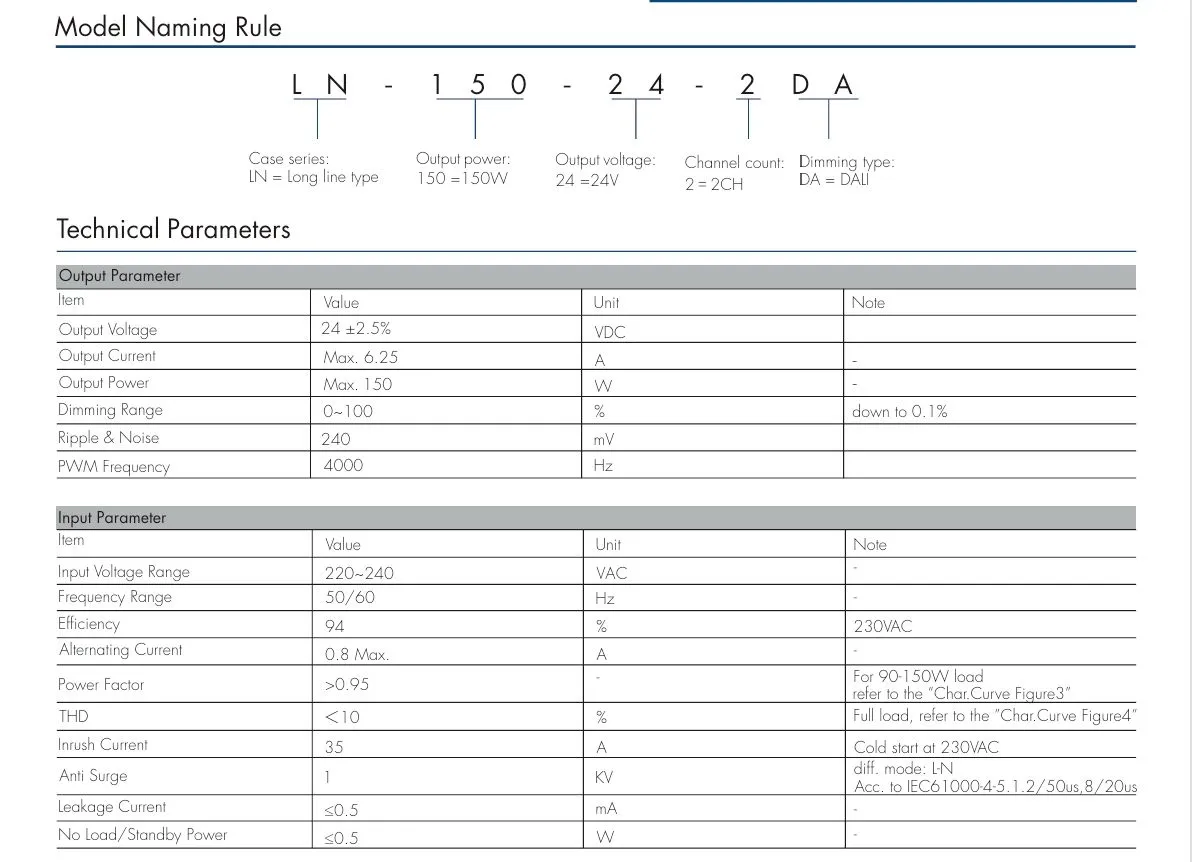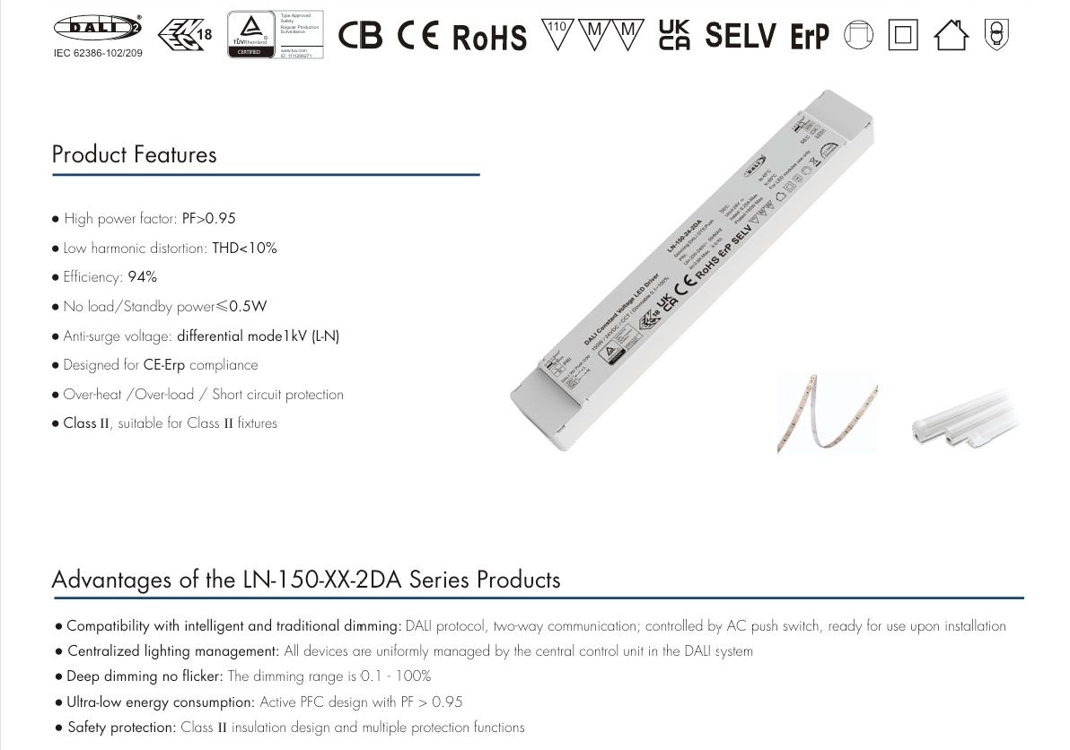 이중 절연: 150W 24V DALI CCT 정전압 LED 드라이버는 기본 절연과 추가 절연으로 구성되어 두 개의 독립적인 절연 보호 레이어를 형성합니다. 한 레이어에 오류가 발생하더라도 다른 레이어는 여전히 감전을 방지할 수 있습니다.