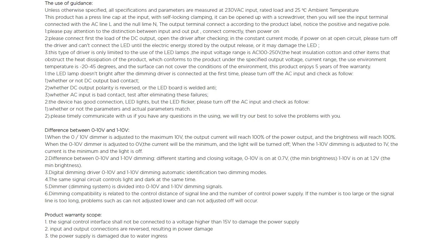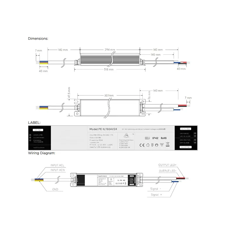 표준 0-10V 디밍 인터페이스를 갖추고 있으며 1%에서 100%까지 부드러운 밝기 조정을 지원하며 시중의 대부분의 주요 디머와 호환됩니다. 최대 95%의 높은 에너지 효율과 100~277V의 넓은 AC 입력 범위를 자랑하는 이 제품은 글로벌 전압 표준에 쉽게 적응하여 국제 프로젝트에 적합합니다.