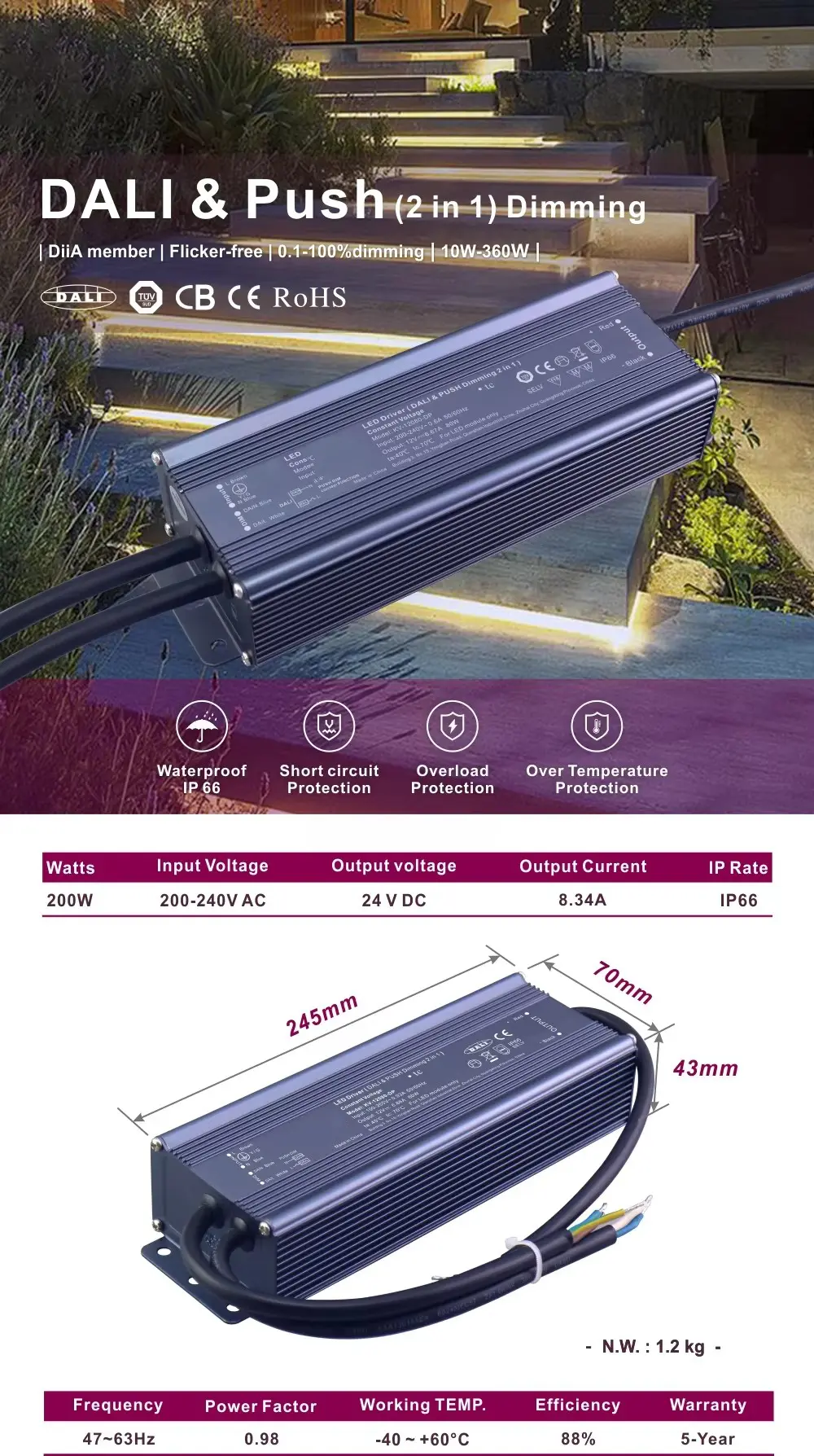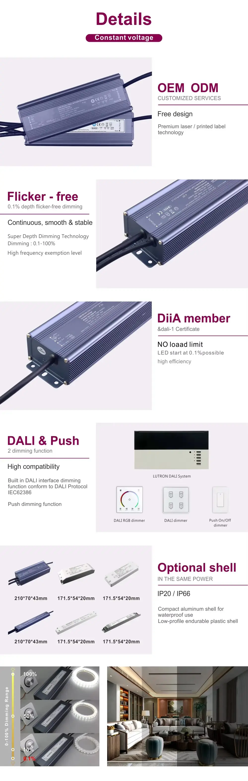 STARWELL 고품질 12V/24V 정전압 LED 드라이버는 고급 DALI-2 프로토콜과 사용자 친화적인 Push Dim 기능을 미래 지향적인 단일 장치에 통합합니다. 기술적 우수성과 실용적인 유연성을 모두 요구하는 건축가, 조명 설계자 및 설치자를 위해 설계된 이 드라이버는 뛰어난 성능을 제공하는 동시에 복잡한 프로젝트를 단순화합니다.