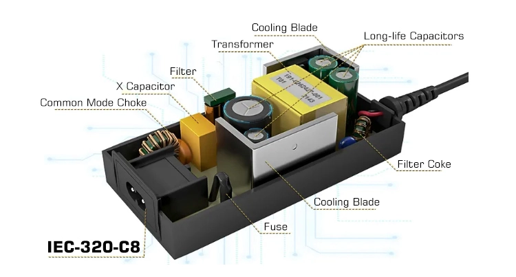 LLC 공진 회로 설계를 적용해 최대 92%(일반 부하 시)의 변환 효율을 달성하고, 대기 전력 소비량은 0.3W로 표준 어댑터에 비해 연간 전기료가 약 7달러 절약됩니다. 한편, 작동 온도는 업계 평균보다 8~10°C 낮아 서비스 수명이 50,000시간 이상으로 늘어납니다.
