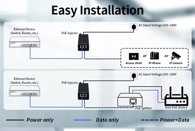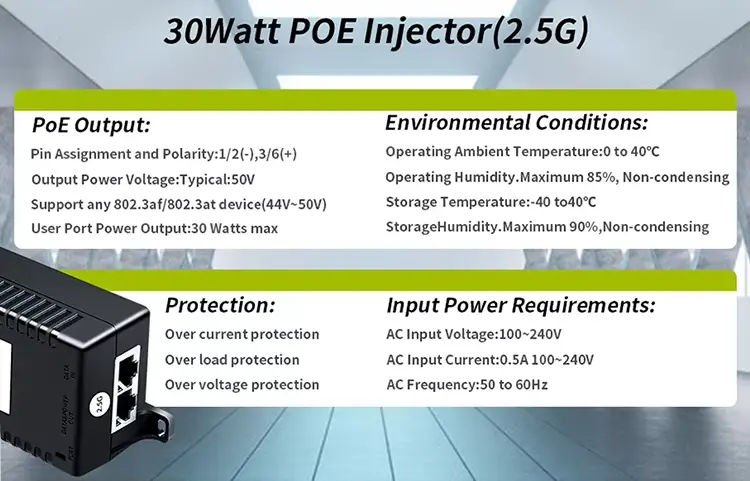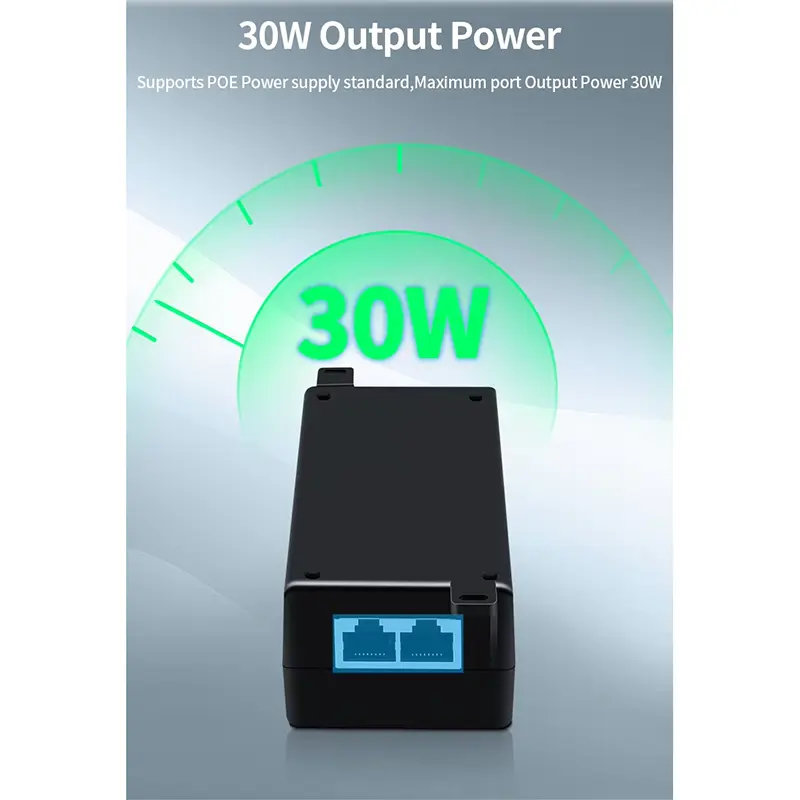 내구성이 뛰어난 구조: 고성능 30W Poe 인젝터는 이음매 없는 초음파 결합 기능을 갖추고 있어 먼지와 물리적 스트레스로부터 더 효과적으로 보호합니다.