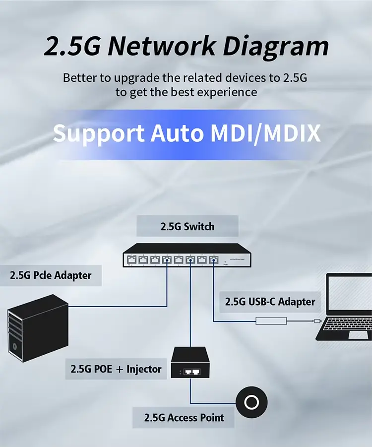 2.5Gbps 데이터 속도를 지원하고 10/100/1000Mbps 장치와 완전히 역호환되어 대역폭 곡선에서 앞서 나가세요.