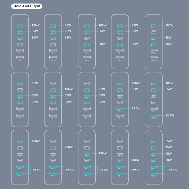 출력 USB C1/C2/C3/C4: 5V/3A 9V/3A 12V/3A 15V/3A 20V/5A(최대 100W) USB A1/A2: 5V/3A 9V/2A 12V/1.5A(최대 18W) |