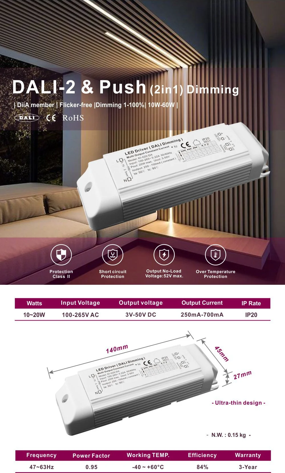 결론적으로, 이 드라이버는 포괄적인 기능과 안정적인 성능을 갖춘 20W 정전류 DALI 조광 LED 드라이버입니다. 복잡한 DALI 지능형 조명 네트워크를 구축해야 하거나 안정적이고 사용하기 쉬운 디밍 가능 드라이버를 찾고 있다면 이 20W DALI 디밍 정전류 LED 드라이버는 모든 종류의 LED 램프에 스마트하고 효율적이며 오래 지속되는 전력을 제공하는 탁월한 선택이 될 수 있습니다.
