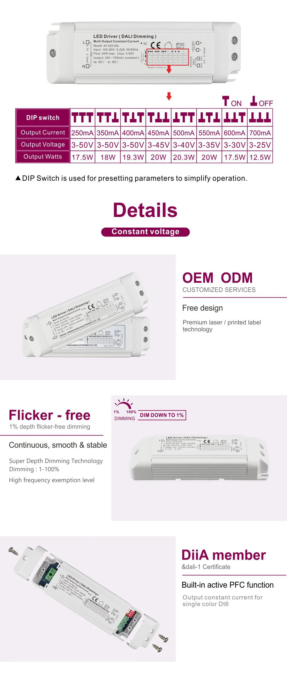 LED 조명을 위한 신뢰할 수 있는 20W Dali 디밍 정전류 전원 공급 장치로서 LED 모듈 또는 조명 스트립에 순수하고 깜박임 없는 정전류를 제공합니다. 제품 하우징은 LED 조명용 조도 조절이 가능한 20W LED 드라이버 AC-DC 정전류 플라스틱 케이스를 채택하고 있으며, 뛰어난 방열 성능을 갖춘 콤팩트하고 견고한 구조를 갖추고 있으며 내장형 및 외장형 설치를 모두 지원합니다.