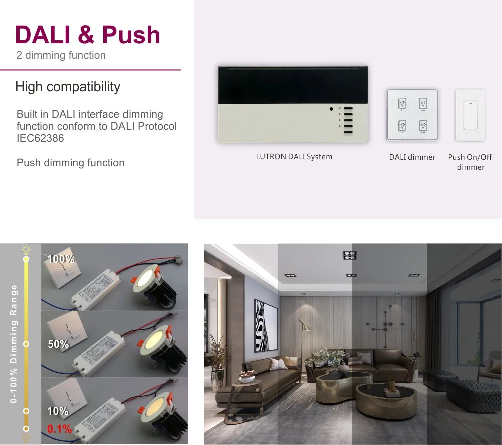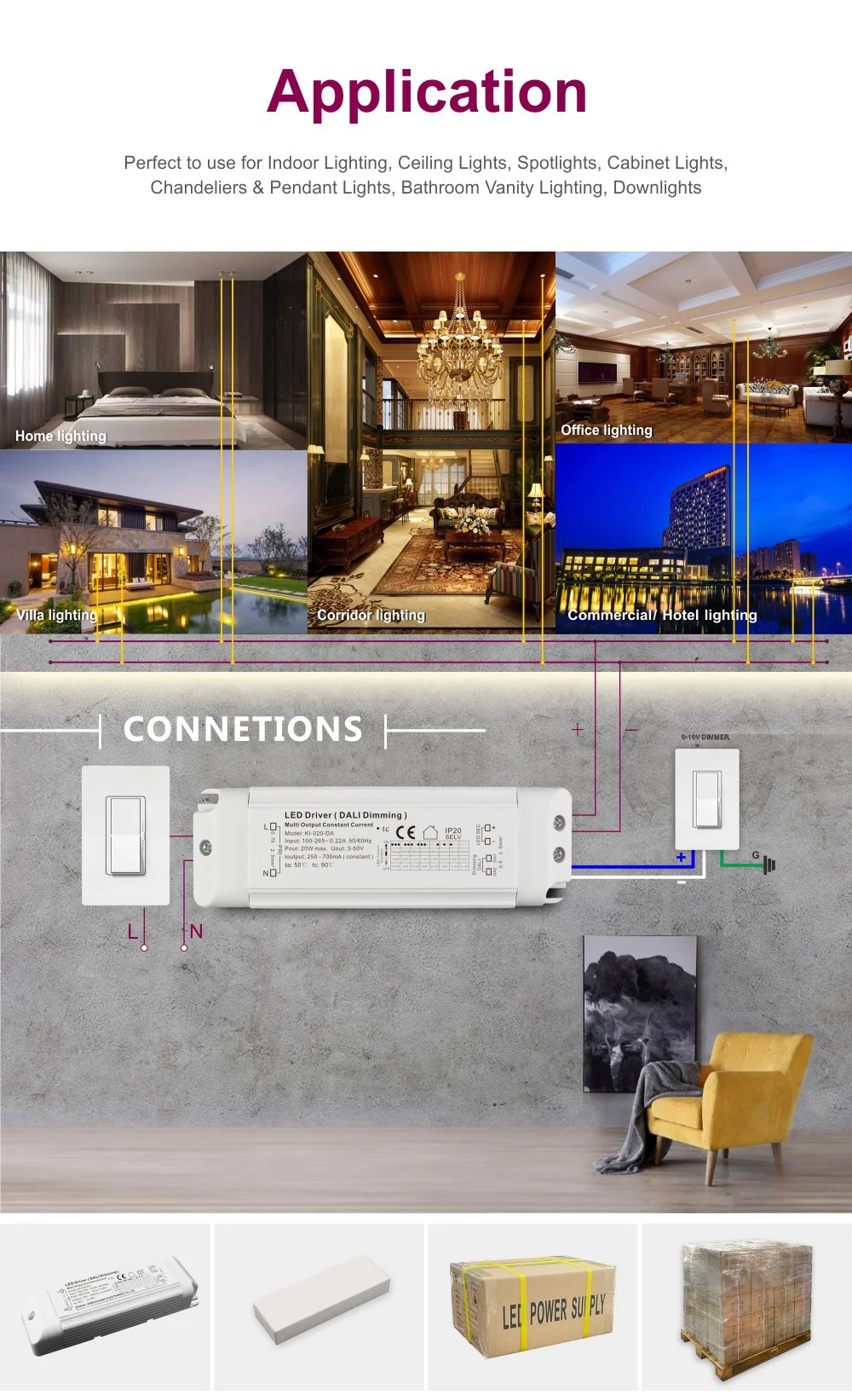 컴팩트한 디자인으로 설치 및 통합이 용이하며 포괄적인 과전압, 과열 및 단락 보호 기능을 제공합니다. 이 제품은 박물관, 사무실, 호텔 등 지능형 장면 기반 조명 제어가 필요한 장소에 적합하며, 효율적인 에너지 절약과 유연한 조명 환경 관리를 달성하기 위한 이상적인 드라이버 솔루션입니다.