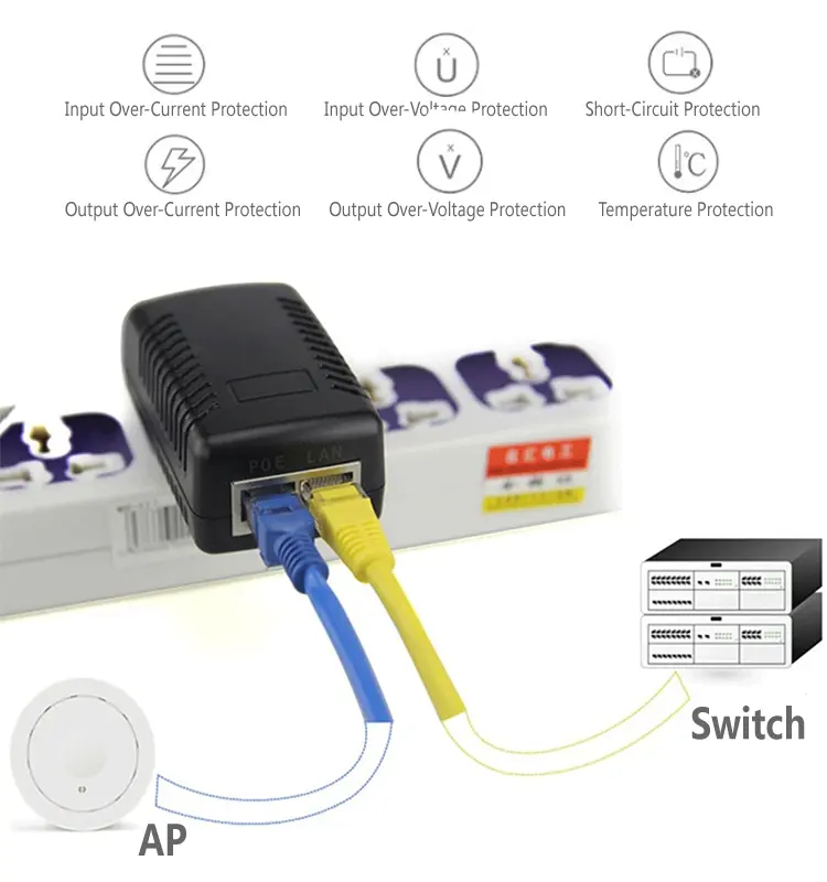 2포트 POE 인젝터는 낮은 리플로 안정적인 전압과 전류를 제공하여 장기적으로 안정적인 작동을 보장합니다. 넓은 입력 전압 100~240VAC는 글로벌 전력망에 적합합니다. 내장된 과전압, 과전류, 단락 및 과열 보호 기능은 듀얼 포트 POE 인젝터와 연결된 장비를 모두 보호합니다.