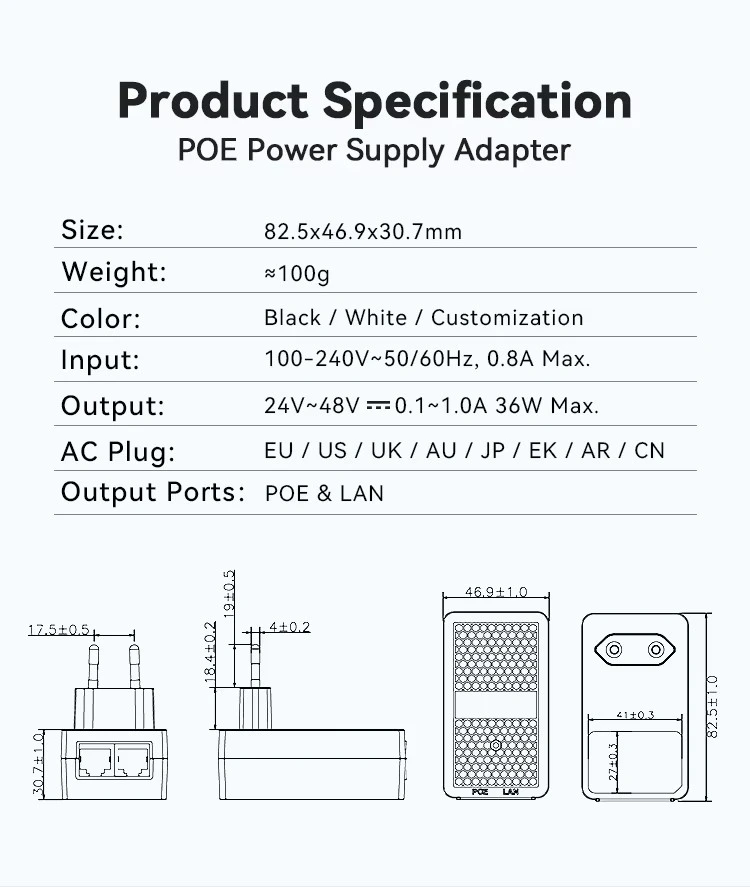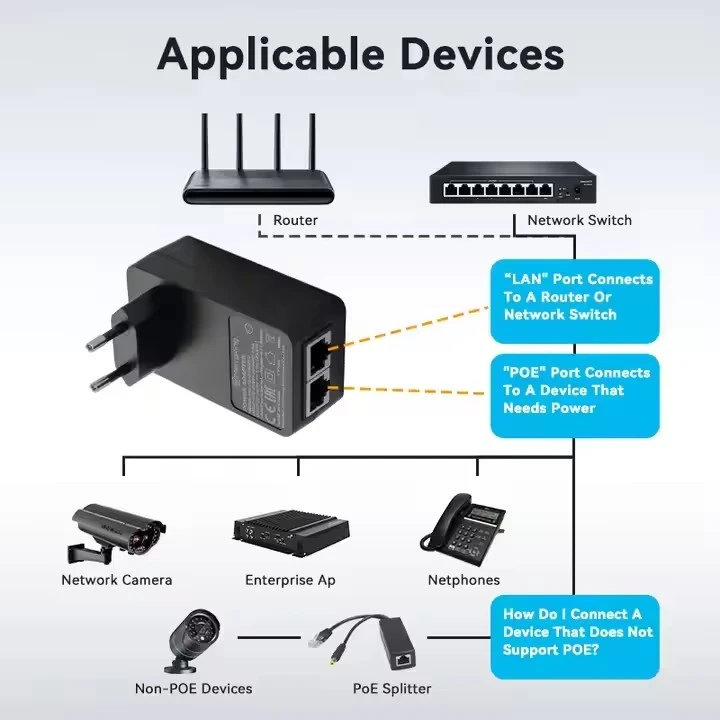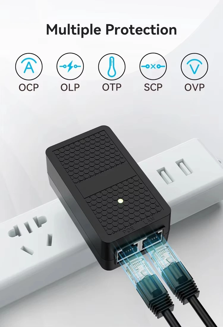STARWELL 공장의 24V 1A 벽걸이형 EU 플러그 POE 인젝터는 선택 가능한 출력(24V/0.5A, 24V/1A 또는 48V/0.5A)이 있는 범용 AC 입력(100-240V)이 특징입니다. 미드스팬(4,5+/7,8-) 및 엔드스팬(1,2+/3,6-)을 포함한 유연한 핀 할당으로 패시브 및 액티브 PoE 프로토콜을 모두 지원합니다. IEEE802.3af/at/bt PoE++ 표준을 완벽하게 준수하며 10/100/1000M에서 2.5G/5G/10G bps 범위의 뛰어난 데이터 속도 기능을 제공합니다.