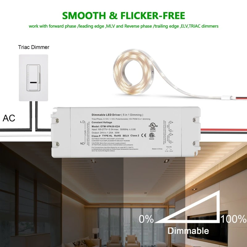 3. 고효율 및 에너지 절약: STARWELL 고품질 30W 24V Triac 조광 LED 드라이버는 최대 88%의 변환 효율과 0.5W 이하의 무부하 전력으로 낮은 전력 소비를 제공하므로 장기적인 에너지 비용을 줄이는 데 도움이 됩니다.