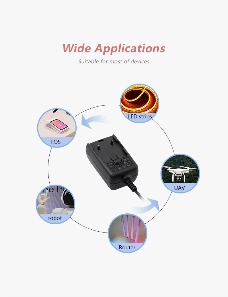 광범위한 응용 시나리오: LED 조명 스트립, 스마트 스피커, 네트워크 라우터 또는 기타 소형 전기 제품에 전원을 공급하는 경우 이 강력한 스위칭 교환 가능 플러그 전원 공급 장치는 가장 이상적이고 안심할 수 있는 선택입니다!