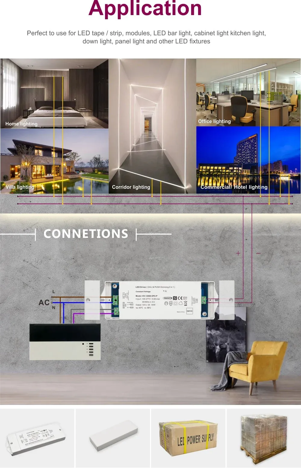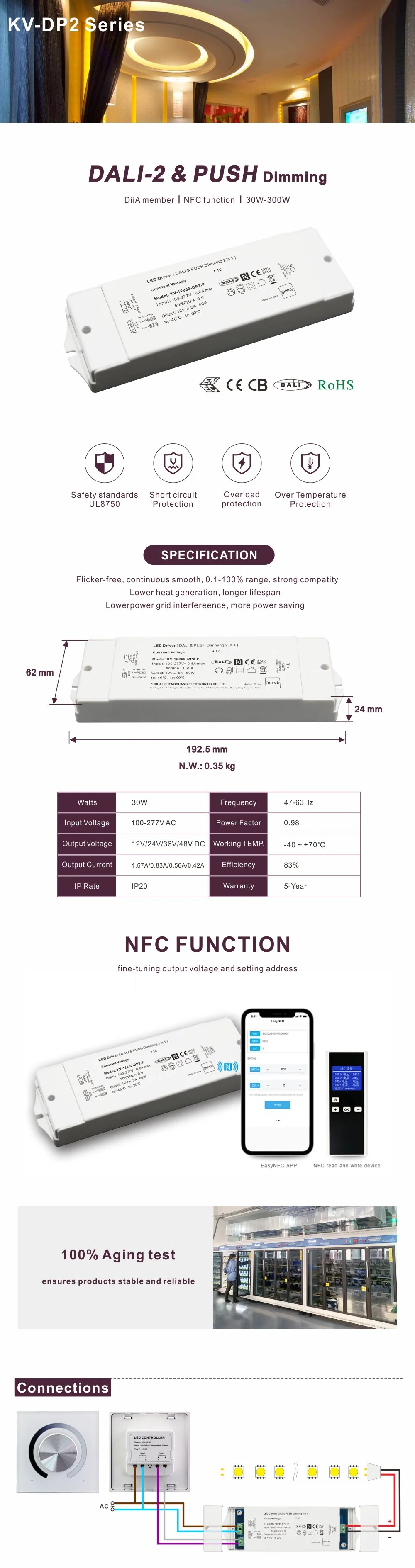 강력한 DALI 기능 외에도 이 드라이버는 뛰어난 디밍 경험을 제공합니다. 부드럽고 매끄러운 NFC Dimming Smooth No Flicker 효과를 달성하여 낮은 밝기 수준에서도 눈에 띄는 깜박임과 떨림을 완전히 제거하여 효과적으로 시력을 보호하고 편안하고 건강한 조명 환경을 조성합니다. 넓은 AC 입력 전압 범위(100-265V 입력) 설계를 통해 전 세계 전력망의 전압 변동에 적응할 수 있어 다양한 지역에서 안정적인 작동을 보장합니다.