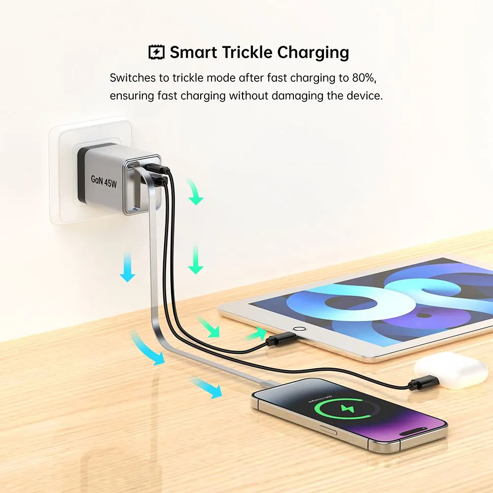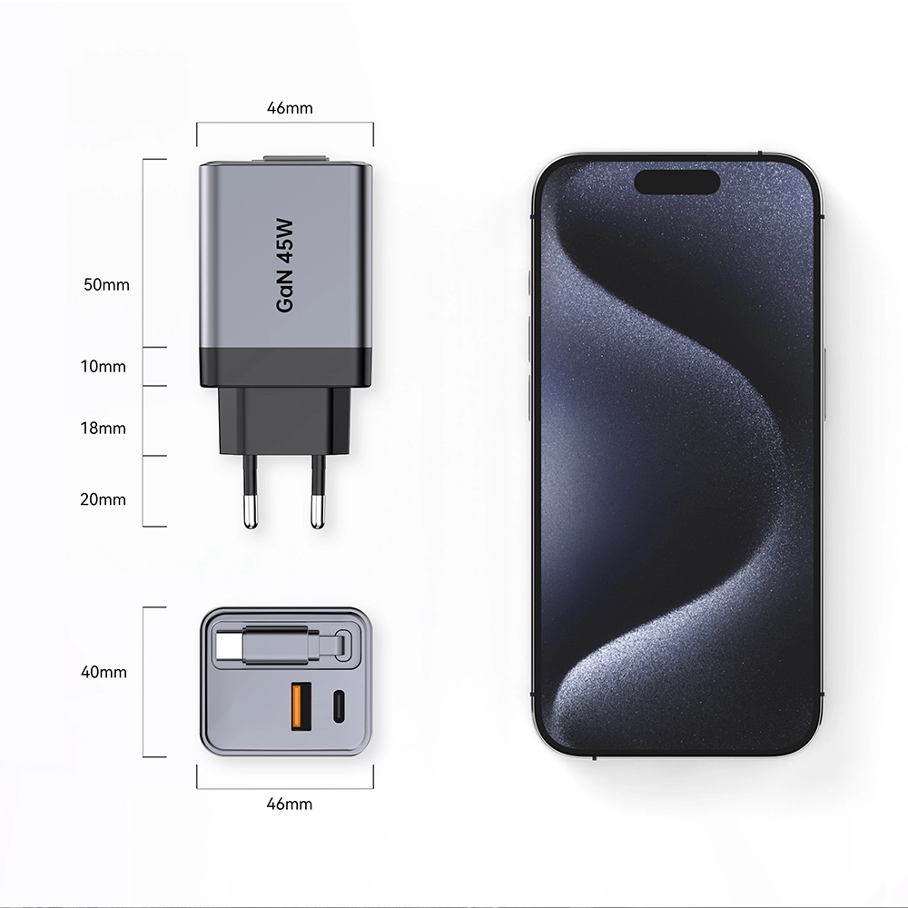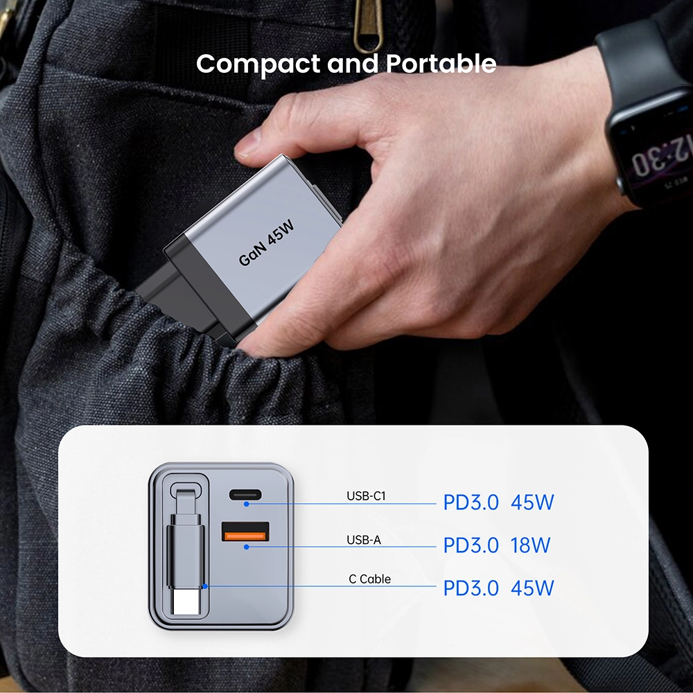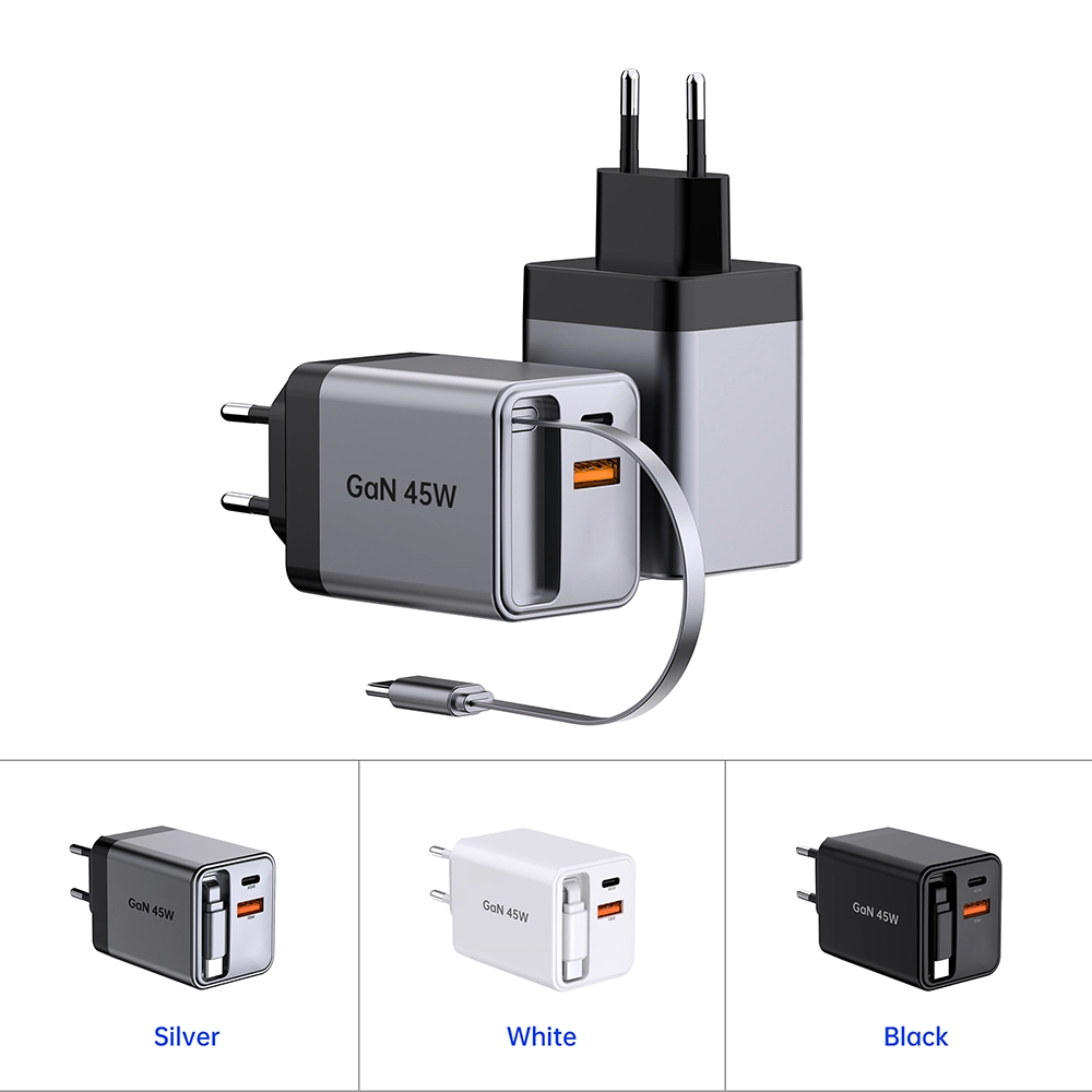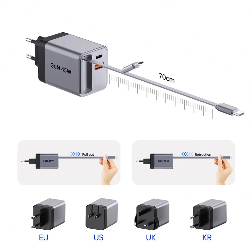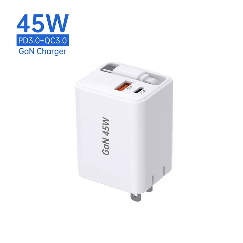 GAN 45W 접이식 고속 충전기 USB-CABLE+USB-A+USB-C 45W PD 충전기(케이블 포함)