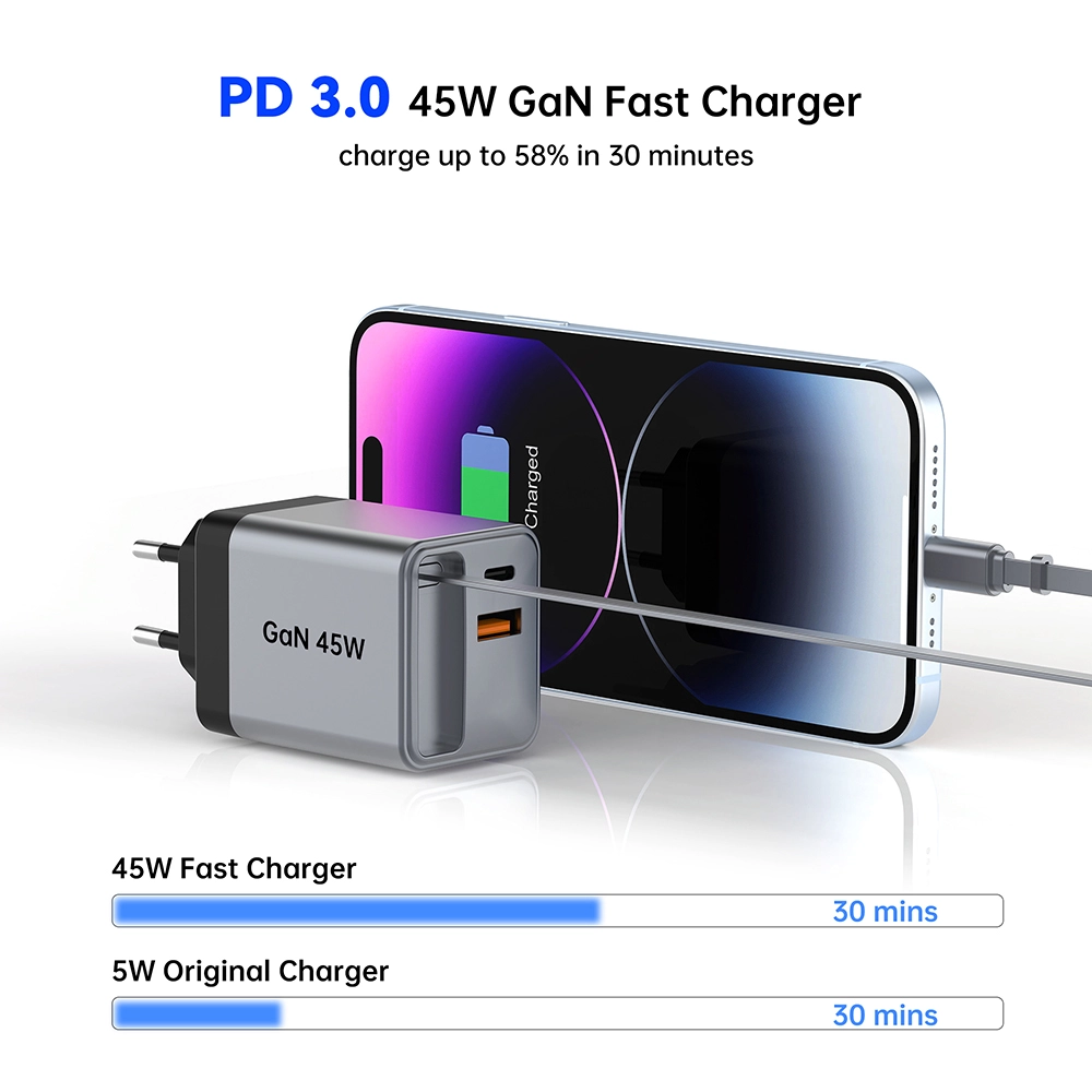 접이식 유형 c 케이블이 포함된 45W EU AC 플러그 PD 충전기 고급 안전 기능: