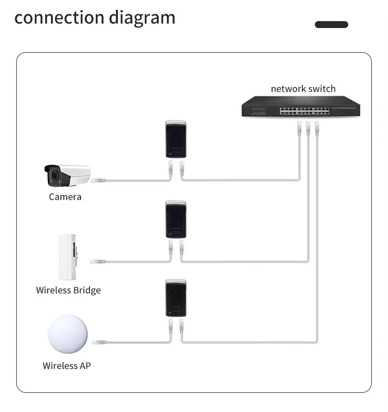 네트워크 브리지: 지점 간 무선 링크에 사용되는 CPE(Customer Premises Equipment) 장치에 전원을 공급하는 데 필수적입니다.