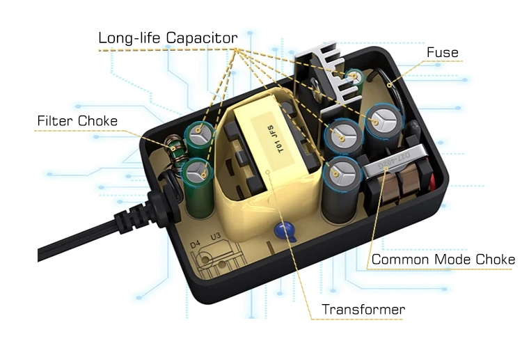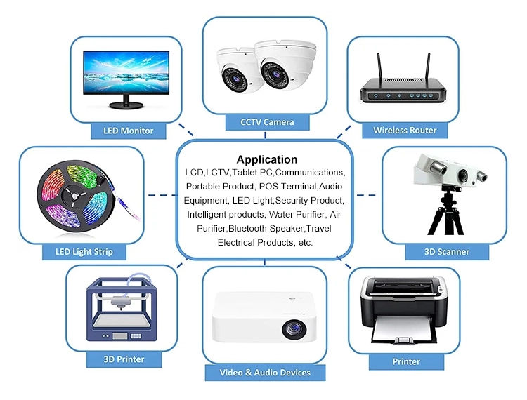 * 48W 시리즈용 추가 장치: 5V/9V/12V/15V/19V/24V/36V/48V 사용 가능 * 안전 : OCP/OVP/OTP, SCP, 자동 과부하 차단, 과전압 차단, 자동 열 차단. * 다양한 호환성: LED 스트립 조명, 3D 프린터, 햄 라디오 트랜시버, CCTV 카메라, 차량용 서브우퍼 앰프, 오디오 앰프, 무선 라우터, ADSL Cats, 가습기, HUB, 키보드, BT 스피커, 모니터, 웹캠, DVR, NVR, 오디오/비디오 전원 공급 장치