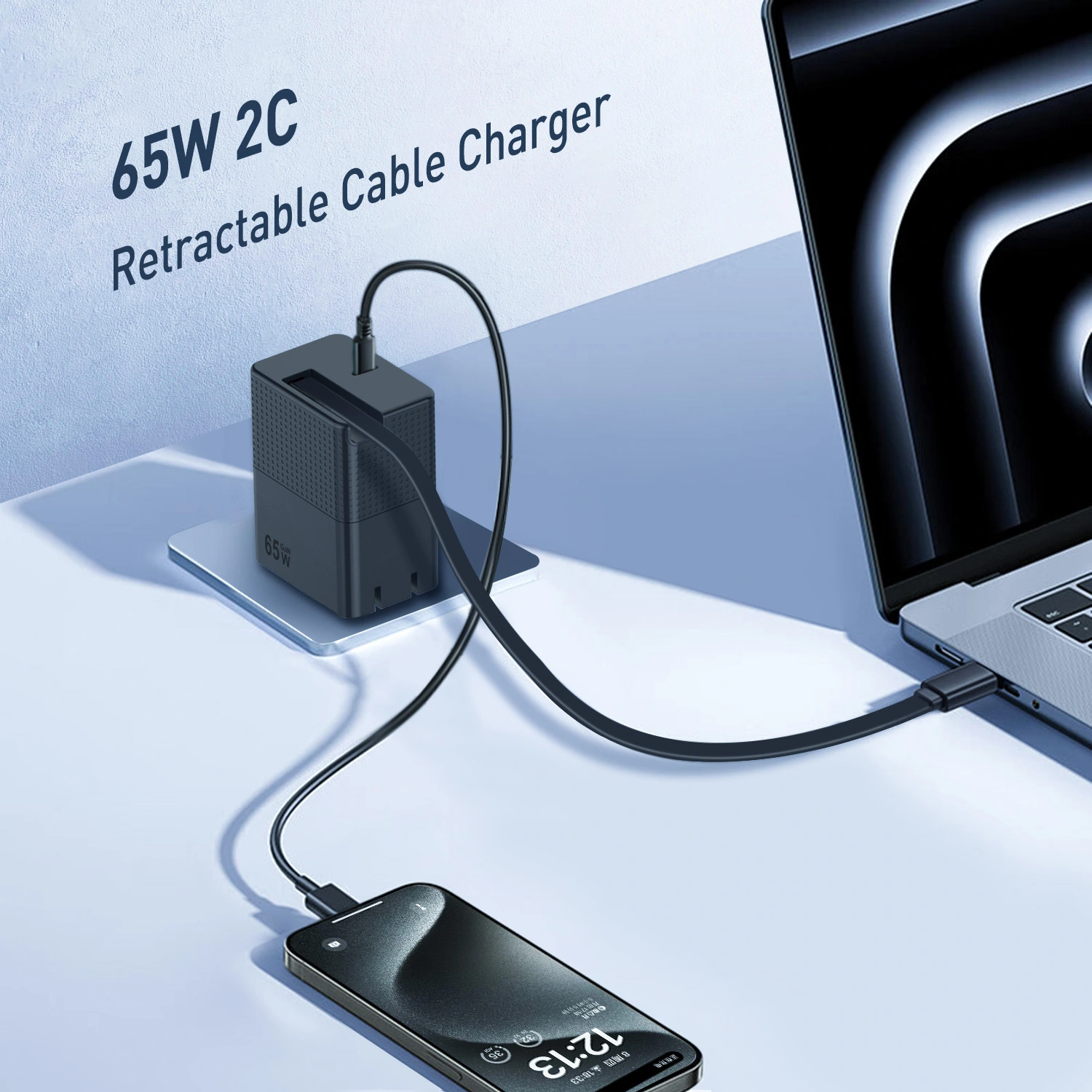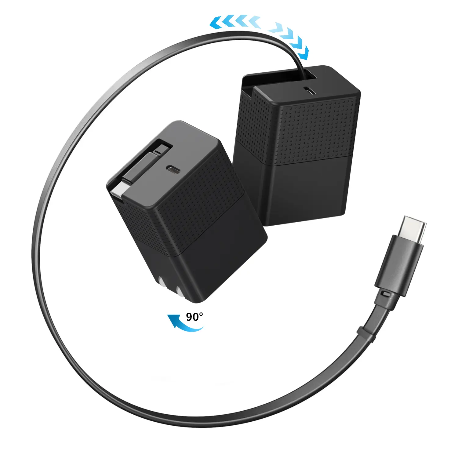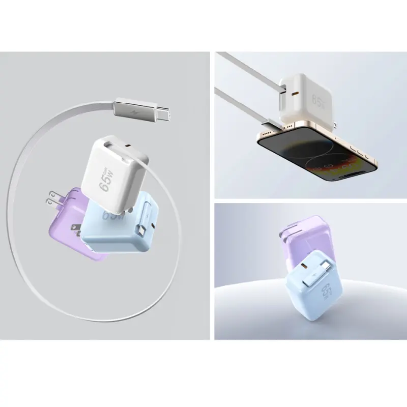 접이식 케이블 장착: 65W 고속 충전 어댑터에는 편리하고 엉키지 않는 1미터 길이의 USB-C 데이터 케이블이 장착되어 있습니다. 이 케이블은 부드럽게 늘어나거나 줄어들 수 있으므로 케이블이 엉키는 것을 피하고 언제든지 충전할 수 있습니다.
