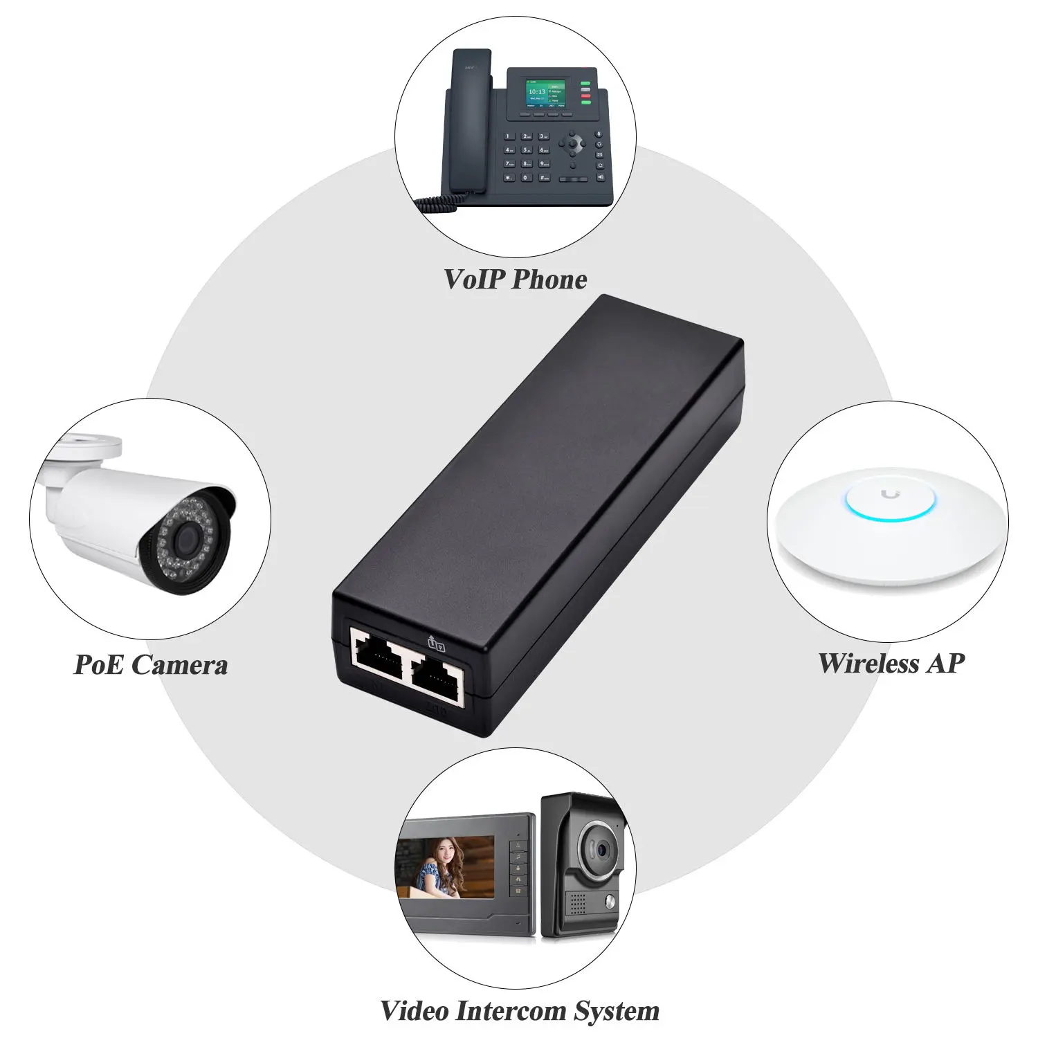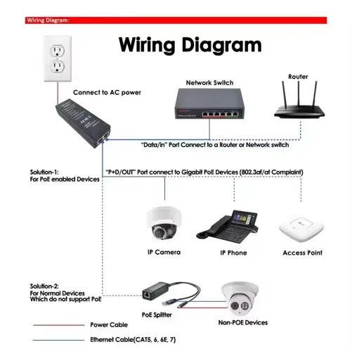 높은 전력 출력: 최대 30W 출력을 지원하여 IP 카메라, 무선 AP 및 VoIP 전화와 같은 네트워크 장치에 효율적으로 전원을 공급하고 연결합니다.
