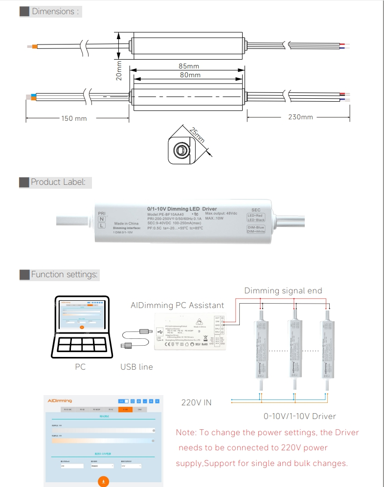 1. 디밍 신호에 액세스하기 전에 제어 신호가 0-10V인지 1-10V인지 확인하고 AIDimming PC 및 소프트웨어를 통해 신호 및 전류 설정을 변경할 수 있습니다. 매개변수를 변경하려면 전원 공급 장치를 220V 전원 공급 장치에 연결해야 하며 일괄적으로 변경할 수 있습니다.