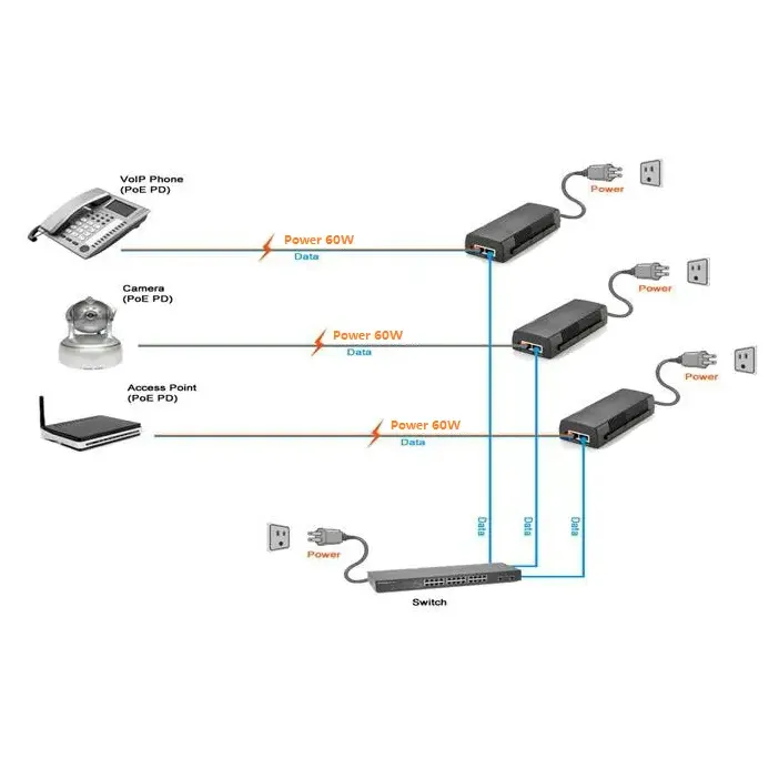 STARWELL 공장의 기가비트 60W 데스크탑 PoE 어댑터는 연중무휴 안정적인 작동을 위해 설계된 고성능 PoE(Power-over-Ethernet) 전원 공급 장치이자 단일 포트 PoE 인젝터입니다. 100~240V AC 50/60Hz의 범용 입력을 지원하고 IEEE 802.3af/at/bt PoE 표준을 준수하여 4쌍의 이더넷 전선을 통해 전체 60W 고전력 출력을 제공합니다.