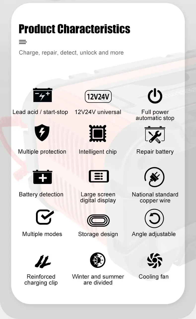 내장된 복구 모드는 배터리를 0V까지 소생시킬 수 있어 TK700 범용 12V 24V 납산 배터리 충전기는 비활성 또는 노후된 배터리 복원에 매우 효과적입니다.