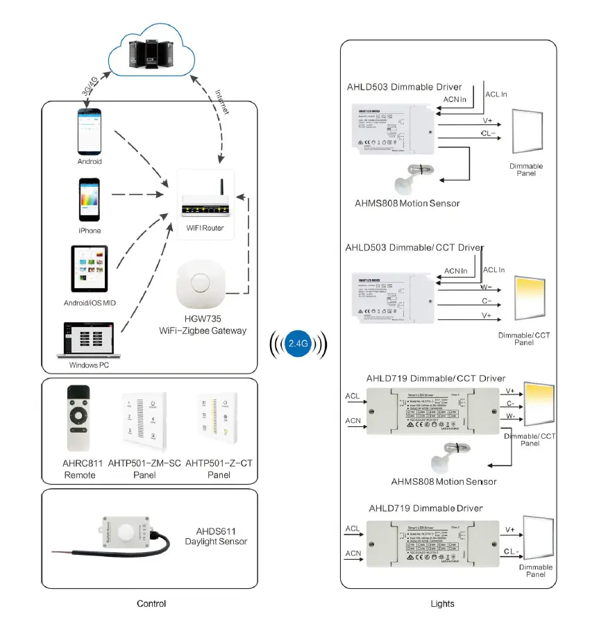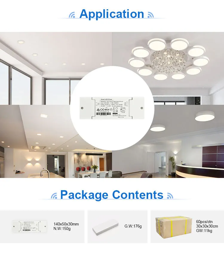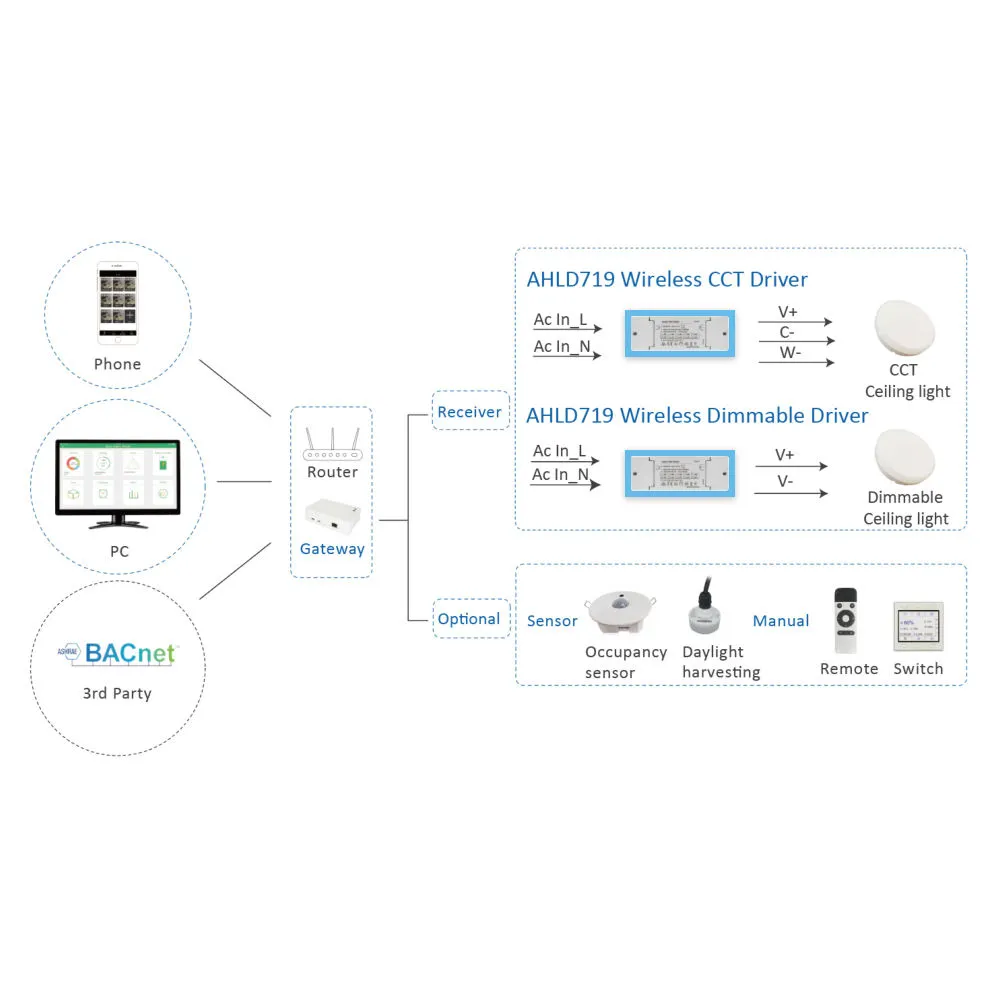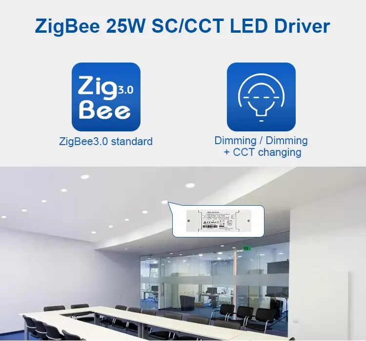 운전자는 Zigbee 메시 네트워크 내에서 작동하고 Zigbee 게이트웨이에 연결하여 스케줄링, 장면 제어, 그룹 제어, 자동화 등 스마트 조명 기능을 활성화합니다. 이러한 유형의 LED 드라이버는 스마트 홈 조명 시스템, 상업용 조명 설치 및 지능형 건물 제어 환경에 일반적으로 사용됩니다.